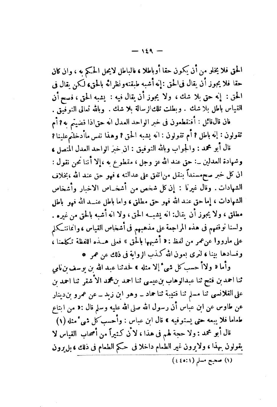 بنقل من اتفق على عدالته فهو حق عند الله بخلاف الشهادات وقال غيرنا إن كل شخص من أشخاص الأخبار وأشخاص الشهادات إما حق عند الله فهو حق مطلق وإما باطل عند الله فهو باطل مطلق ولا يجوز أن يقال إنه يشبه الحق ولا إنه أشبه بالحق من غيره ولسنا نوقفهم في هذه المراجعة على مذهبهم في أشخاص القياس وإنما نتكلم على ما رووا عن عمر من لفظ أشبهها بالحق فعلى هذه اللفظة تكلمنا وفسادها بينا لنرى بعون الله كذب الرواية في ذلك عن عمر وأما ولا أحسب كل شيء إلا مثله فحدثنا عبد الله بن يوسف بن نامي ثنا أحمد بن فتح ثنا عبد الوهاب بن عيسى ثنا أحمد بن محمد الأشقر ثنا أحمد بن علي القلانسي ثنا مسلم ثنا قتيبة ثنا حماد وهو ابن زيد عن عمر بن دينار عن طاوس عن ابن عباسأن رسول الله صلى الله عليه وسلم قال من ابتاع طعاما فلا يبعه حتى يستوفيه قال ابن عباس واحسب كل شيء مثله قال أبو محمد ولا حجة لهم في هذا لأن كثيرا من أصحاب القياس لا يقولون بهذا ولا يرون غير الطعام داخلا في حكم الطعام في ذلك بل يرون
