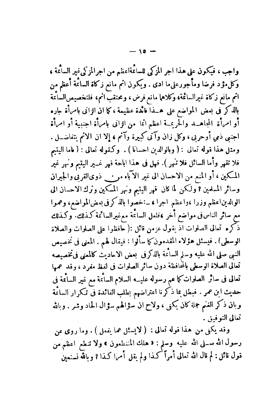 واجب فيكون على هذا أجر المزكي غير للسائمة أعظم من أجر المزكي غير السائمة وكل مؤد فرضا ومأجور على ما أدى ويكون إثم مانع زكاة السائمة أعظم من إثم مانع زكاة غير السائمة وكلاهما مانع فرض ومحتقب إثم فلتخصيص السائمة بالذكر في بعض المواضع على هذا فائدة عظيمة كما أن الزاني بامرأة جاره أو امرأة المجاهد والحريمة أعظم إثما من الزاني بامرأة أجنبية أو امرأة أجنبي ذمي أو حربي وكل زان وآت كبيرة وآثم إلا أن الإثم يتفاضل ومثل هذا قوله تعالى {وقضى ربك ألا تعبدوا إلا إياه وبلوالدين إحسانا إما يبلغن عندك لكبر أحدهما أو كلاهما فلا تقل لهمآ أف ولا تنهرهما وقل لهما قولا كريما} وكقوله تعالى {فأما ليتيم فلا تقهر * وأما لسآئل فلا تنهر} فهل في هذا إباحة قهر غير اليتيم ونهر غير المسكين أو المنع من الإحسان إلى غير الآباء من ذوي القربى والجيران وسائر المسلمين ولكنه لما كان قهر اليتيم ونهر المسكين وترك الإحسان إلى الوالدين أعظم وزرا وأعظم أجرا خصوا بالذكر في بعض المواضع وعموا مع سائر الناس في مواضع أخر فلعل السائمة مع غير السائمة كذلك وكذلك ذكره تعالى الصلوات إذ يقول عز من قائل {حافظوا على لصلوات ولصلاة لوسطى وقوموا لله قانتين} فيسأل هؤلاء المقدمون كما سألوا فيقال لهم المعنى في تخصيص النبي صلى الله عليه وسلم السائمة بالذكر في بعض الأحاديث كالمعنى في تخصيصه تعالى الصلاة الوسطى بالمحافظة دون الصلوات في لفظ مفرد وقد عمهما تعالى في سائر الصلوات كما عم رسوله صلى الله عليه وسلم السائمة مع غير السائمة في حديث ابن عمر فبطل بما ذكرنا اعتراضهم بطلب الفائدة في تكرار السائمة وبأن ذكر الغنم جملة كان يكفي ولاح أن سؤالهم