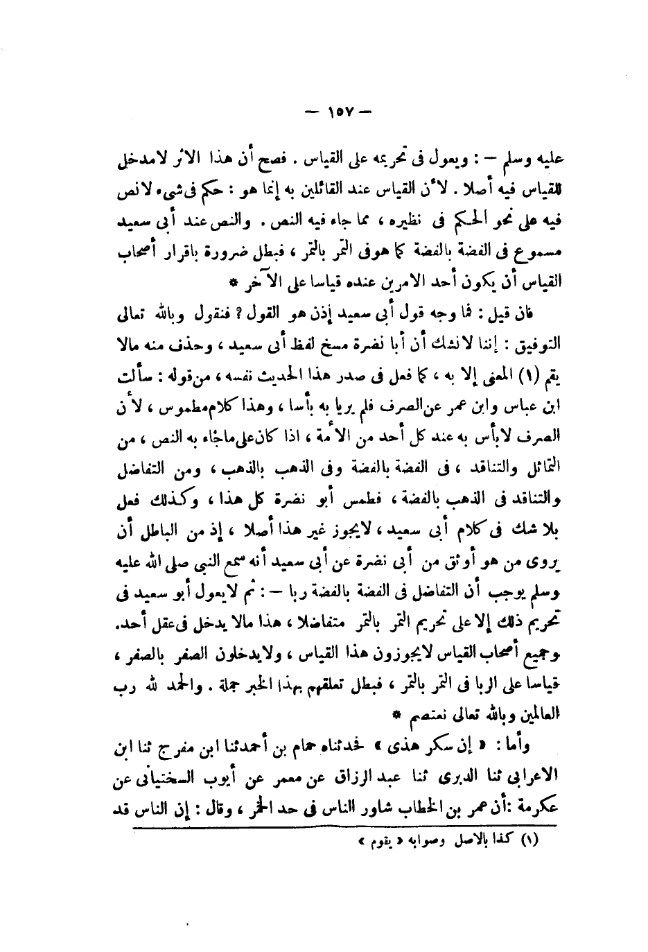 عليه وسلم ويعول في تحريمه على القياس فصح أن هذا الأثر لا مدخل للقياس فيه أصلا لأن القياس عند القائلين به إنما هو حكم في شيء ولا نص فيه على نحو الحكم في نظيره مما جاء فيه النص والنص عند أبي سعيد مسموع في الفضة بالفضة كما هو في التمر بالتمر فبطل ضرورة إقرار أصحاب القياس أن يكون أحد الأمرين عنده قياسا على الآخر فإن قيل فما وجه قول أبي سعيد إذن هو القول فنقول وبالله تعالى التوفيق إننا لا نشك أن أبا نضرة مسخ لفظ أبي سعيد وحذف منه ما لا يقوم المعنى إلا به كما فعل في صدر هذا الحديث نفسه من قوله سألت ابن عباس وابن عمر عن الصرف فلم يريا به بأسا وهذا كلام مطموس لأن الصرف لا بأس به عند كل أحد من الأمة إذا كان على ما جاء به النص من التماثل والتعاقد في الفضة بالفضة وفي الذهب بالذهب ومن التفاضل والتناقد في الذهب بالفضة فطمس أبو نضرة كل هذا وكذلك فعل بلا شك في كلام أبي سعيد ولا يجوز غير هذا أصلا إذ من الباطل أن يروي من هو أوثق من أبي نضرة عن أبي سعيد أنه سمع النبي صلى الله عليه وسلم يوجب أن التفاضل في الفضة بالفضة ربا ثم لا يعول أبو سعيد في تحريم ذلك إلا على تحريم التمر بالتمر متفاضلا هذا ما لا يدخل في عقل أحد وجميع أصحاب القياس لا يجوزون هذا القياس ولا يدخلون الصفر بالصفر قياسا على الربا في التمر بالتمر فبطل تعلقهم بهذا الخبر جملة والحمد لله رب العالمين وبالله تعالى نعتصم وأما سكر هذى فحدثناه حمام بن أحمد ثنا ابن مفرج ثنا ابن الأعرابي ثنا الدبري نا عبد الرزاق عن معمر عن أيوب السختياني عن عكرمة أن عمر بن الخطاب شاور الناس في حد الخمر وقال إن الناس قد