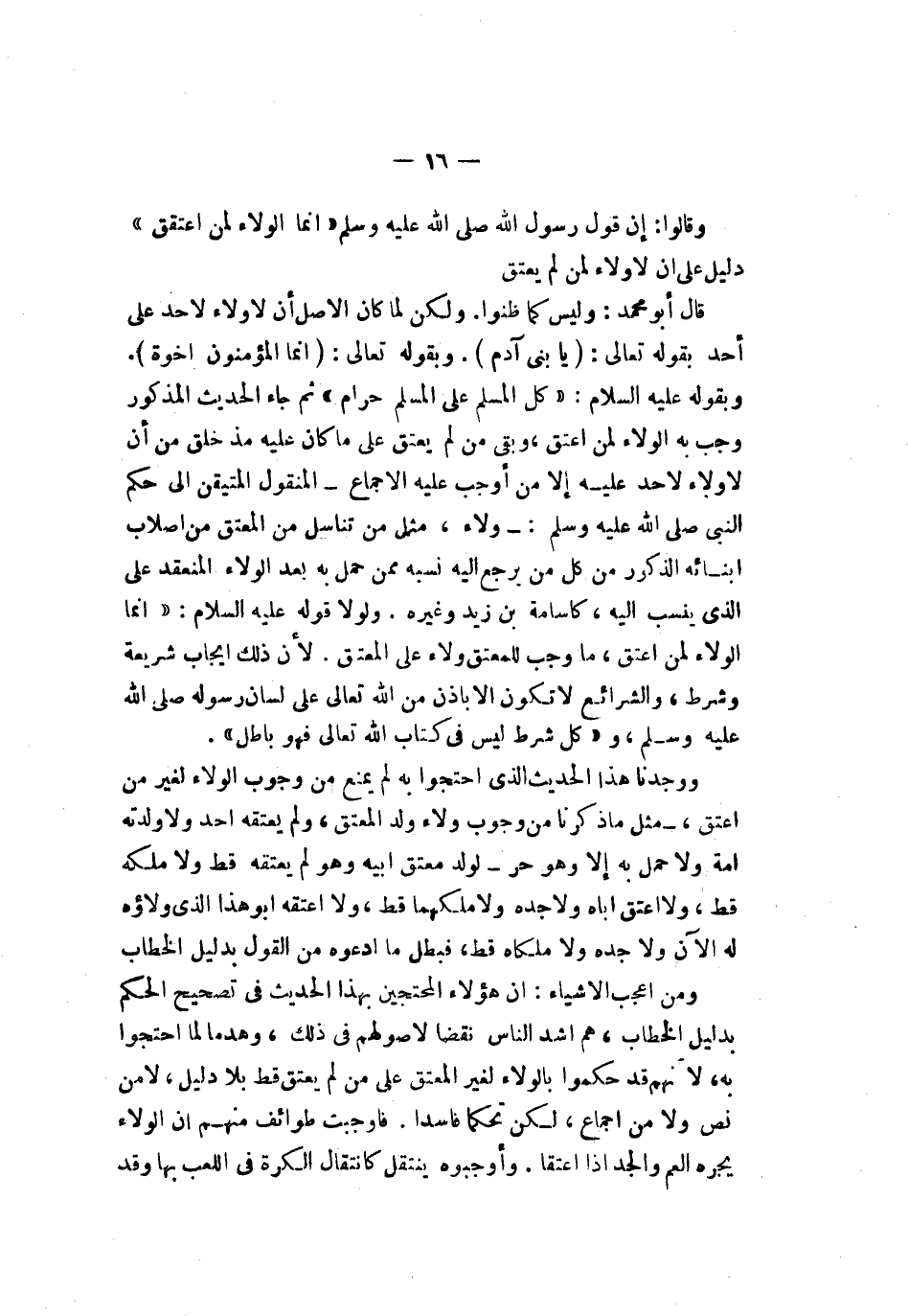 وقالوا إن قول رسول الله صلى الله عليه وسلم إنما الولاء لمن أعتق دليل على أن ولاء لمن لم يعتق قال أبو محمد وليس كما ظنوا ولكن لما كان الأصل أن لا ولاء لأحد على أحد بقوله تعالى {يابني آدم قد أنزلنا عليكم لباسا يواري سوءاتكم وريشا ولباس لتقوى ذلك خير ذلك من آيات لله لعلهم يذكرون} وبقوله تعالى {بل عجبوا أن جآءهم منذر منهم فقال لكافرون هذا شيء عجيب} وبقوله صلى الله عليه وسلم كل المسلم على المسلم حرام ثم جاء الحديث المذكور وجب به الولاء لمن أعتق وبقي من لم يعتق على ما كان عليه مذ خلق من أن لا ولاء لأحد عليه إلا من أوجب عليه الإجماع المنقول المتيقن إلى حكم النبي صلى الله عليه وسلم ولولا مثل من تناسل من المعتق من أصلاب أبنائه الذكور من كل من يرجع إليه نسبه ممن حمل به بعد الولاء المنعقد على الذي ينتسب إليه كأسامة بن زيد وغيره ولولا قوله صلى الله عليه وسلم إنما الولاء لمن أعتق ما وجب المعتق ولاء على المعتق لأن ذلك إيجاب شريعة وشرط والشرائع لا تكون إلا بإذن من الله تعالى على لسان رسوله صلى الله عليه وسلم وكل شرط ليس في كتاب الله تعالى فهو باطل ووجدنا هذا الحديث الذي احتجوا به لم يمنع من وجوب الولاء لغير من أعتق مثل ما ذكرنا من وجوب ولاء ولد المعتق ولم يعتقه أحد ولا ولدته أمه ولا حمل به إلا وهو حر لولد معتق أبيه وهو لم يعتقه قط ولا ملكه قط ولا أعتق أباه ولا جده ولا ملكهما قط ولا أعتقه أبو هذا الذي ولاؤه الآن ولا جده ولا ملكاه قط فبطل ما ادعوه من القول بدليل الخطاب ومن أعجب الأشياء أن هؤلاء المحتجين بهذا الحديث في تصحيح الحكم بدليل الخطاب هم أشد