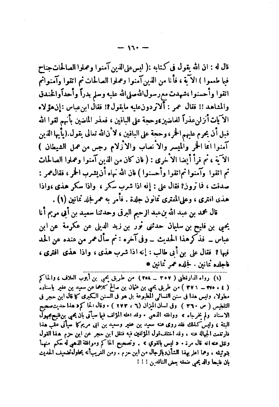 قال له إن الله تعالى يقول في كتابه {ليس على لذين آمنوا وعملوا لصالحات جناح فيما طعموا إذا ما تقوا وآمنوا وعملوا الصالحات ثم اتقوا وآمنوا ثم اتقوا وأحسنوا ولله يحب لمحسنين} فأنا من الذين آمنوا وعملوا الصالحات ثم اتقوا وآمنوا ثم اتقوا وأحسنوا شهدت مع رسول الله صلى الله عليه وسلم بدرا وأحدا والخندق والمشاهد فقال عمر ألا تردون عليه ما يقول فقال ابن عباس إن هؤلاء الآيات أنزلن عذرا للماضين وحجة على الباقين فعذر الماضين بأنهم لقوا الله قبل أن يحرم عليهم الخمر وحجة على الباقين لأن الله تعالى يقول {يأيها لذين آمنوا إنما لخمر ولميسر ولأنصاب ولأزلام رجس من عمل لشيطان فجتنبوه لعلكم تفلحون} ثم قرأ الأخرى فإن كان من الذين {ليس على لذين آمنوا وعملوا لصالحات جناح فيما طعموا إذا ما تقوا وآمنوا وعملوا الصالحات ثم اتقوا وآمنوا ثم اتقوا وأحسنوا ولله يحب لمحسنين} فإن الله نهاه أن يشرب الخمر فقال عمر صدقت فما ترون فقالعلي إنه إذا شرب سكر وإذا سكر هذى وإذا هذى افترى وعلى المفتري ثمانون جلدة فأمر به عمر فجلد ثمانين قال محمد بن عبد الله بن عبد الرحيم البرقي وحدثنا سعيد بن أبي مريم أنا يحيى بن فليح بن سليمان حدثني ثور بن زيد الديلمي عن عكرمة عن ابن عباس فذكر هذا الحديث وفي آخر ثم سأل من عنده عن الحد فيها فقال علي بن أبي طالب إنه إذا شرب هذى وإذا هذى افترى فاجلده ثمانين فجلده عمر ثمانين
