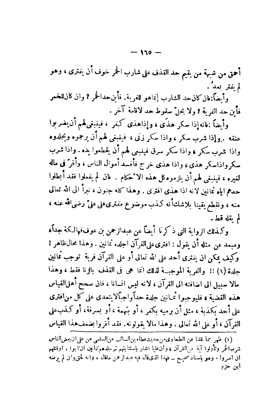 أحمق من شبهة من يقيم حد القذف على شارب الخمر خوف أن يفتري وهو لم يفتر بعد وأيضا فإن كان حد الشارب إنما هو للفرية فأين حد الخمر وإن كان للخمر فأين حد الفرية ولا يحل سقوط حد لإقامة آخر وأيضا فإنه إذا سكر هذى وإذا هذى كفر فينبغي لهم أن يضربوا عنقه وإذا شرب سكر وإذا سكر زنى فينبغي لهم أن يرجموه ويجلدوه وإذا شرب سكر وإذا سكر سرق فينبغي لهم أن يقطعوا يده وإذا شرب سكر وإذا سكر هذى وإذا هذى خرج فأفسد أموال الناس وأقر في ماله لغيره فينبغي لهم أن يلزموه كل هذه الأحكام فإن لم يفعلوا فقد أبطلوا حدهم إياه ثمانين لأنه إذا هذى افترى وهذا كله جنون نبرأ إلى الله تعالى منه ونقطع يقينا بلا شك أنه كذب موضوع مفترى على علي رضي الله عنه لم يقله قط وكذلك الرواية التي ذكرنا أيضا عن عبد الرحمن بن عوف فهالكة جدا مبعد عن مثله أن يقول افترى على القرآن اجلده ثمانين وهذا محال ظاهرا وكيف يمكن أن يفتري أحد على الله تعالى أو على القرآن فرية توجب ثمانين جلدة والفرية الموجبة لذلك إنما هي في القذف بالزنى فقط وهذا ما لا سبيل إلى إضافته إلى القرآن لأنه ليس إنسانا فإن صحح أهل القياس هذه القضية فليوجبوا ثمانين جلدة حدا واجبا لا يتعد على كل من افترى على أحد بكذبة مثل أن يرميه بكفر أو بتهمة أو بسرقة أو كذب على القرآن أو على الله تعالى وهذا ما لا يقولونه فقد أقروا بضعف هذا القياس