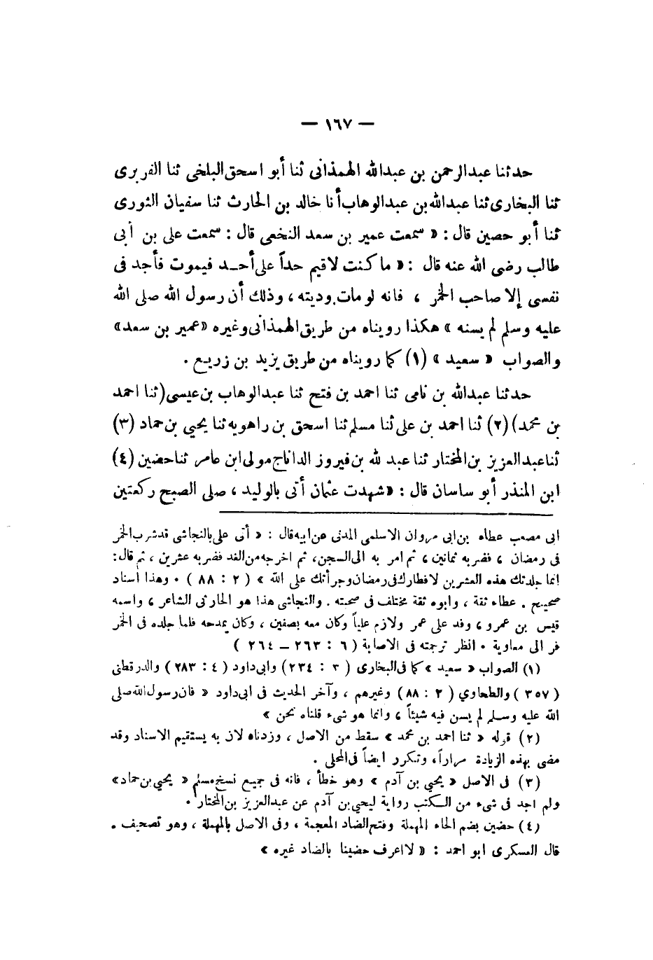 حدثنا عبد الرحمن بن عبد الله الهمداني ثنا أبو إسحاق البلخي ثنا الفربري ثنا البخاري ثنا عبد الله بن عبد الوهاب أنا خالد بن الحارث ثنا سفيان الثوري ثنا أبو حصين قال سمعت عمير بن سعد النخعي قال سمعت علي بن أبي طالب رضي الله عنه قال ما كنت لأقيم حدا على أحد فيموت فأجد في نفسي إلا صاحب الخمر فإنه لو مات وديته وذلك أن رسول الله صلى الله عليه وسلم لم يسنه هكذا رويناه من طريق الهمداني وغيره عمير بن سعد والصواب سعيد كما رويناه من طريق يزيد بن زريع حدثنا عبد الله بن نامي ثنا أحمد بن فتح ثنا عبد الوهاب بن عيسى ثنا أحمد بن محمد ثنا أحمد بن علي ثنا مسلم ثنا إسحاق بن راهويه ثنا يحيى بن حماد ثنا عبد العزيز بن المختار ثنا عبد الله بن فيروز الديباج مولى ابن عامر نا حصين بن المنذر أبو ساسان قال شهدت عثمان أتي بالوليد صلى الصبح ركعتين