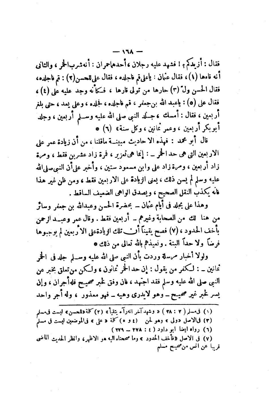 عليه علي فقال علي يا عبد الله بن جعفر قم فاجلده فجلده وعلي يعد حتى بلغ أربعين فقال أمسك جلد النبي صلى الله عليه وسلم أربعين وجلد أبو بكر أربعين وعمر ثمانين وكل سنة قال أبو محمد فهذه الأحاديث مبينة ما قلنا من أن زيادة عمر على الأربعين التي هي حد الخمر إنما هي تعزير فمرة زاد عشرين فقط ومرة زاد أربعين ومرة زاد علي وابن مسعود ستين وأخبر علي أن النبي صلى الله عليه وسلم لم يسن ذلك يعني الزيادة على الأربعين فقط ومن ظن غير هذا فإنه يكذب النقل الصحيح ويصدق الواهي الضعيف الساقط وهذا علي يجلد في أيام عثمان بحضرة الحسن وعبد الله بن جعفر وسائر من هنالك من الصحابة وغيرهم أربعين فقط وقال عمر وعبد الرحمن بأخف الحدود فصح يقينا أن تلك الزيادة على الأربعين لم يوجبوها فرضا ولا حدا البتة ونعيذهم بالله تعالى من ذلك ولو أخبار مرسلة وردت بأن النبي صلى الله عليه وسلم جلد في الخمر ثمانين لكفر من يقول إن حد الخمر ثمانون ولكن من تعلق بخبر عن النبي صلى الله عليه وسلم فقد اجتهد فإن وفق لخبر صحيح فله أجران وإن يسر لخبر غير صحيح وهو لا يدري وهيه فهو معذور وله أجر واحد