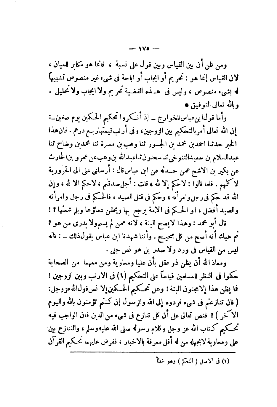 أو الحكم في الأمة يرجع بها ويحقن دماؤها ولم شعثها قال أبو محمد وهذا لا يصح البتة لأنه عمن لم يسم ولا يدري من هو ثم هبك أنه أصح من كل صحيح وأننا شهدنا ابن عباس يقول ذلك فإنه ليس من القياس من ورد ولا صدر بل هو نص جلي ومعاذ الله أن يظن ذو عقل بأن عليا ومعاوية ومن معهما من الصحابة حكموا في النظر للمسلمين قياسا على التحكيم في الأرنب وبين الزوجين فما يظن هذا إلا مجنون البتة