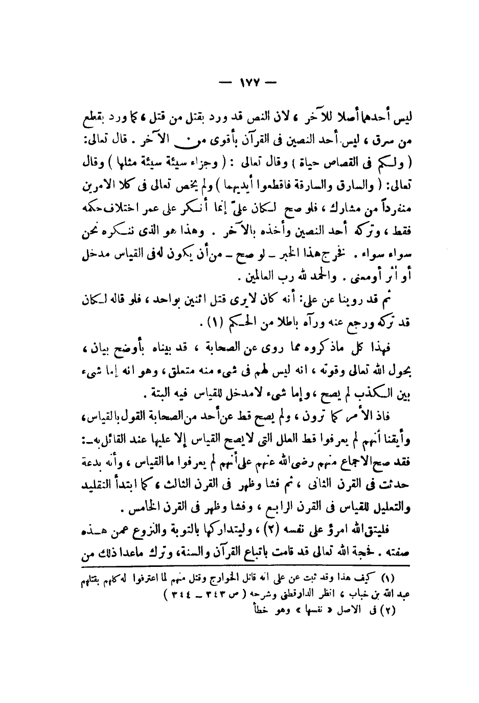 وهذا هو الذي ننكره نحن سواء بسواء فخرج هذا الخبر لو صح من أن يكون له في القياس مدخل أو أثر أو معنى والحمد لله رب العالمين ثم قد روينا عن علي أنه كان لا يرى قتل اثنين بواحد فلو قاله لكان قد تركه ورجع عنه ورآه باطلا من الحكم فهذا كل ما ذكروه مما روي عن الصحابة قد بيناه بأوضح بيان بحول الله تعالى وقوته أنه ليس لهم في شيء منه متعلق وهو أنه إما شيء بين الكذب لم يصح وإما شيء لا مدخل للقياس فيه البتة فإذا الأمر كما ترون ولم يصح قط عن أحد من الصحابة القول بالقياس وأيقنا أنهم لم يعرفوا قط العلل التي لا يصح القياس إلا عليها عند القائل به فقد صح الإجماع منهم رضي الله عنهم على أنهم لم يعرفوا ما القياس وبأنه بدعة حدثت في القرن الثاني ثم فشا وظهر في القرن الثالث كما ابتدأ التقليد والتعليل للقياس في القرن الرابع وفشا وظهر في القرن الخامس فليتق الله امرؤ على نفسه وليتداركها بالتوبة والنزوع عمن هذه صفته فحجة الله تعالى قد قامت باتباع القرآن والسنة وترك ما عدا ذلك من