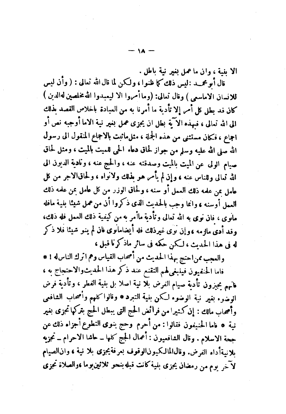ولا نواه ولحاق الأجر من كل عامل بمن علمه ذلك العمل أو سنه ولحاق الوزر من كل عامل بمن علمه ذلك العمل أو سنه وإنما وجب بالحديث الذي ذكروا أن من عمل شيئا بنية ما فله ما نوى فإن نوى به الله تعالى وتأدية ما أمر به من كيفية ذلك العمل فله ذلك وقد أدى ما لزمه وإن نوى غير ذلك فله أيضا ما نوى فإن لم ينو شيئا فلا ذكر له في هذا الحديث لكن حكمه في سائر ما ذكرنا قبل والعجب ممن احتج بهذا الحديث من أصحاب القياس وهم أترك الناس له فأما الحنفيون فينبغي لهم التقنع عند ذكر هذا الحديث والاحتجاج به فإنهم يجيزون تأدية صيام الفرض بلا نية أصلا بل بنية الفطر وتأدية فرض الوضوء بغير نية الوضوء لكن بنية التبرد وقالوا كلهم وأصحاب الشافعي وأصحاب مالك إن كثيرا من فرائض الحج التي يبطل الحج بتركها تجزي بغير نية فأما الحنفيون فقالوا من أحرم وحج ينوي التطوع أجزأه ذلك عن حج الإسلام وقال الشافعيون أعمال الحج كلها حاشا الإحرام تجزيه بلا نية أداء الفرض وقال المالكيون الوقوف بعرفة يجزي بلا نية وأن الصيام لآخر يوم من رمضان يجزي بنية كانت قبله بنحو ثلاثين يوما والصلاة تجزيه