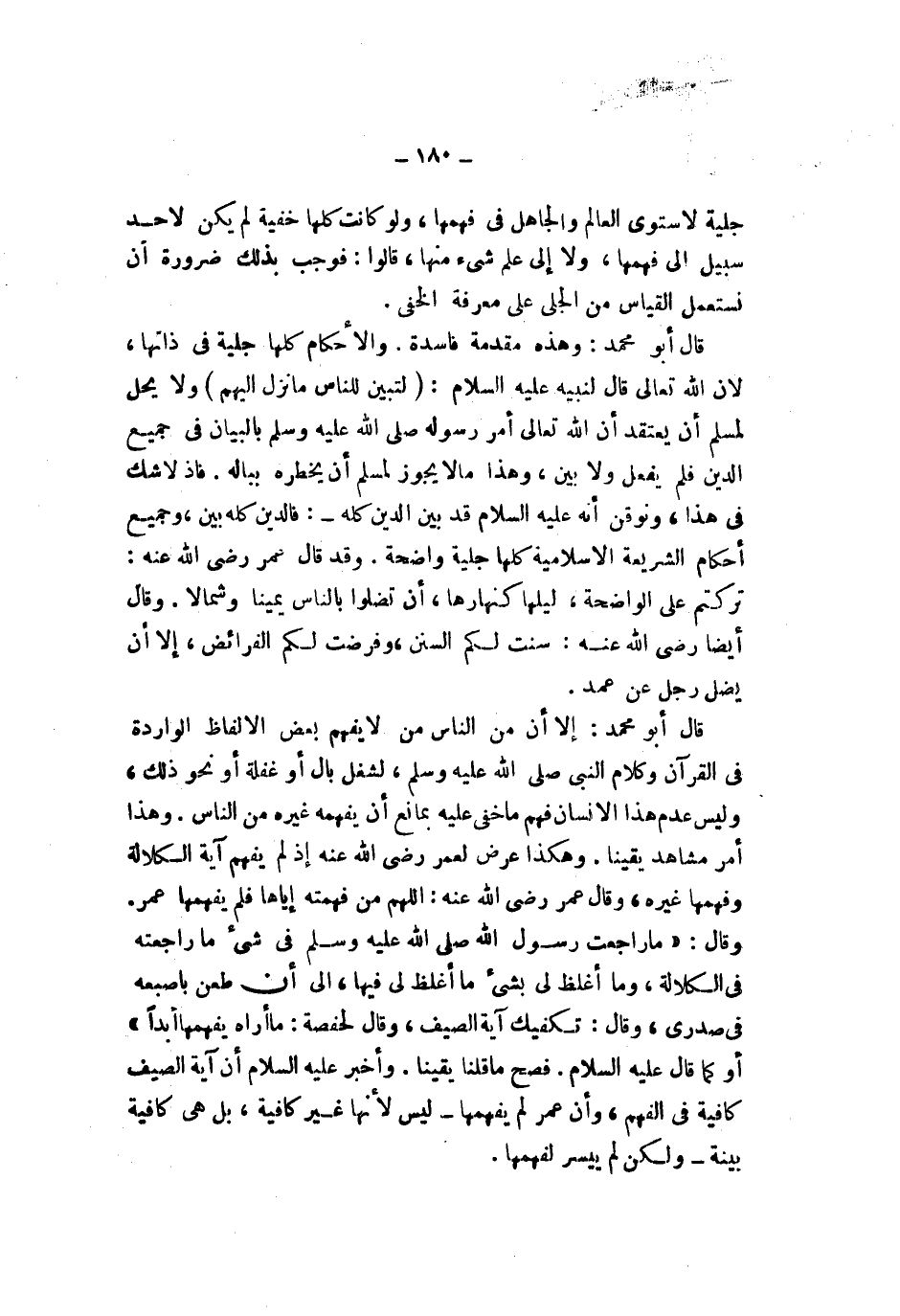 جلية لاستوى العالم والجاهل في فهمها ولو كانت كلها خفية لم يكن لأحد سبيل إلى فهمها ولا إلى علم شيء منها قالوا فوجب بذلك ضرورة أن نستعمل القياس من الجلي على معرفة الخفي قال أبو محمد وهذه مقدمة فاسدة والأحكام كلها جلية في ذاتها لأن الله تعالى قال لنبيه صلى الله عليه وسلم {بلبينات ولزبر وأنزلنا إليك لذكر لتبين للناس ما نزل إليهم ولعلهم يتفكرون} ولا يحل لمسلم أن يعتقد أن الله تعالى أمر رسوله صلى الله عليه وسلم بالبيان في جميع الدين فلم يفعل ولا بين وهذا ما لا يجوز لمسلم أن يخطره بباله فإذ لا شك في هذا ونوقن أنه صلى الله عليه وسلم قد بين الدين كله فالدين كله بين وجميع أحكام الشريعة الإسلامية كلها جلية واضحة وقد قال عمر رضي الله عنه تركتم على الواضحة ليلها كنهارها أن تضلوا بالناس يمينا وشمالا وقال أيضا رضي الله عنه سننت لكم السنن وفرضت لكم الفرائض إلا أن يضل رجل عن عمد قال أبو محمد إلا أن من الناس من لا يفهم بعض الألفاظ الواردة في القرآن وكلام النبي صلى الله عليه وسلم لشغل بال أو غفلة أو نحو ذلك وليس عدم هذا الإنسان فهم ما خفي عليه بمانع أن يفهمه غيره من الناس وهذا أمر مشاهد يقينا وهكذا عرض لعمر رضي الله عنه إذا لم يفهم آية الكلالة وفهمها غيره وقال عمر رضي الله عنه اللهم من فهمته إياها فلم يفهمها عمر وقال ما راجعت رسول الله صلى الله عليه وسلم في شيء ما راجعته في الكلالة وما أغلظ لي بشيء ما أغلظ لي فيها إلى أن طعن بأصبعه في صدري وقال لحفصة ما أراه يفهمها أبدا أو كما قال صلى الله عليه وسلم فصح ما قلناه يقينا وأخبر صلى الله عليه وسلم أن آية الصيف كافية الفهم وأن عمر لم يفهمها ليس لأنها غير كافية بل هي كافية بينة ولكن لم ييسر لفهمها