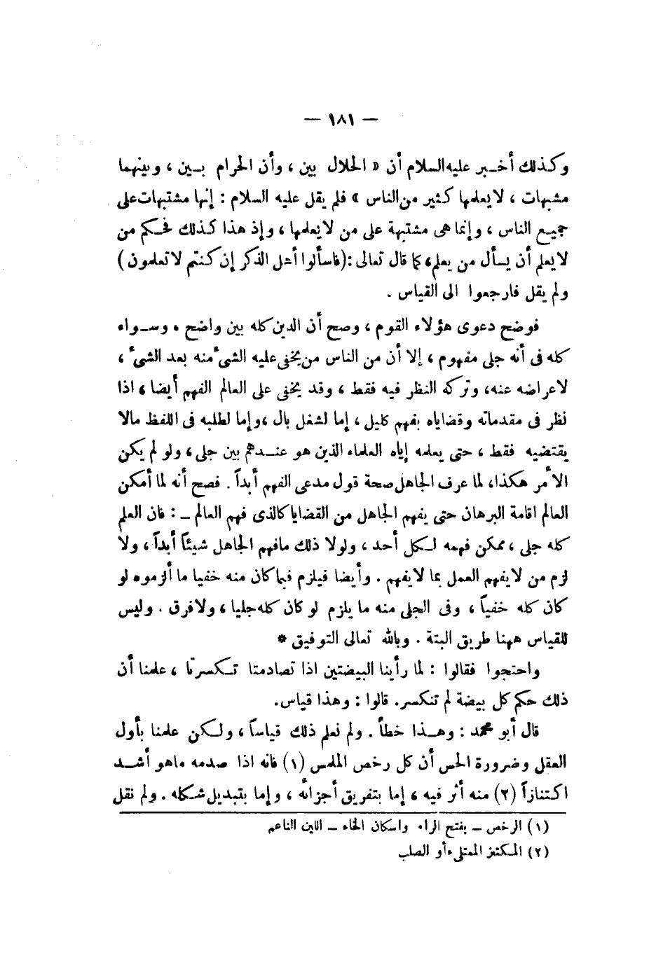 مشتبهة على من لا يعلمها وإذ هذا كذلك فحكم من لا يعلم أن يسأل من يعلم كما قال تعالى {ومآ أرسلنا من قبلك إلا رجالا نوحي إليهم فسألوا أهل لذكر إن كنتم لا تعلمون} ولم يقل فارجعوا إلى القياس فوضع دعوى هؤلاء القوم وصح أن الدين كله بين واضح وسواء كله في أنه جلي مفهوم إلا أن من الناس من يخفى عليه الشيء منه بعد الشيء لإعراضه عنه وتركه النظر فيه فقط وقد يخفى على العالم الفهم أيضا إذا نظر في مقدماته وقضاياه بفهم كليل إما لشغل بال وإما لطلبه في اللفظ ما لا يقتضيه فقط حتى يعلمه إياه العلماء الذين هو عندهم بين جلي ولو لم يكن الأمر هكذا لما عرف الجاهل صحة قول مدعي الفهم أبدا فصح أنه لما أمكن العالم إقامة البرهان حتى يفهم الجاهل من القضايا كالذي فهم العالم فإن العلم كله جلي ممكن فهمه لكل أحد ولولا ذلك ما فهم الجاهل شيئا ولا لزم من لا يفهم العمل بما لا يفهم وأيضا فيلزم فيما كان منه خفيا ما ألزموه لو كان كله خفيا وفي الجلي منه ما يلزم لو كان كله جليا ولا فرق وليس للقياس ههنا طريق البتة وبالله تعالى التوفيق واحتجوا فقالوا لما رأينا البيضتين إذا تصادمتا تكسرتا علمنا أن ذلك حكم كل بيضة لم تنكسر قالوا وهذا قياس قال أبو محمد وهذا خطأ ولم نعلم ذلك قياسا ولكن علمنا بأول العقل وضرورة الحس أن كل رخص الملمس فإنه إذا صدمه ما هو أشد منه اكتنازا أثر فيه إما بتفريق أجزائه وإما بتبديل شكله ولم نقل