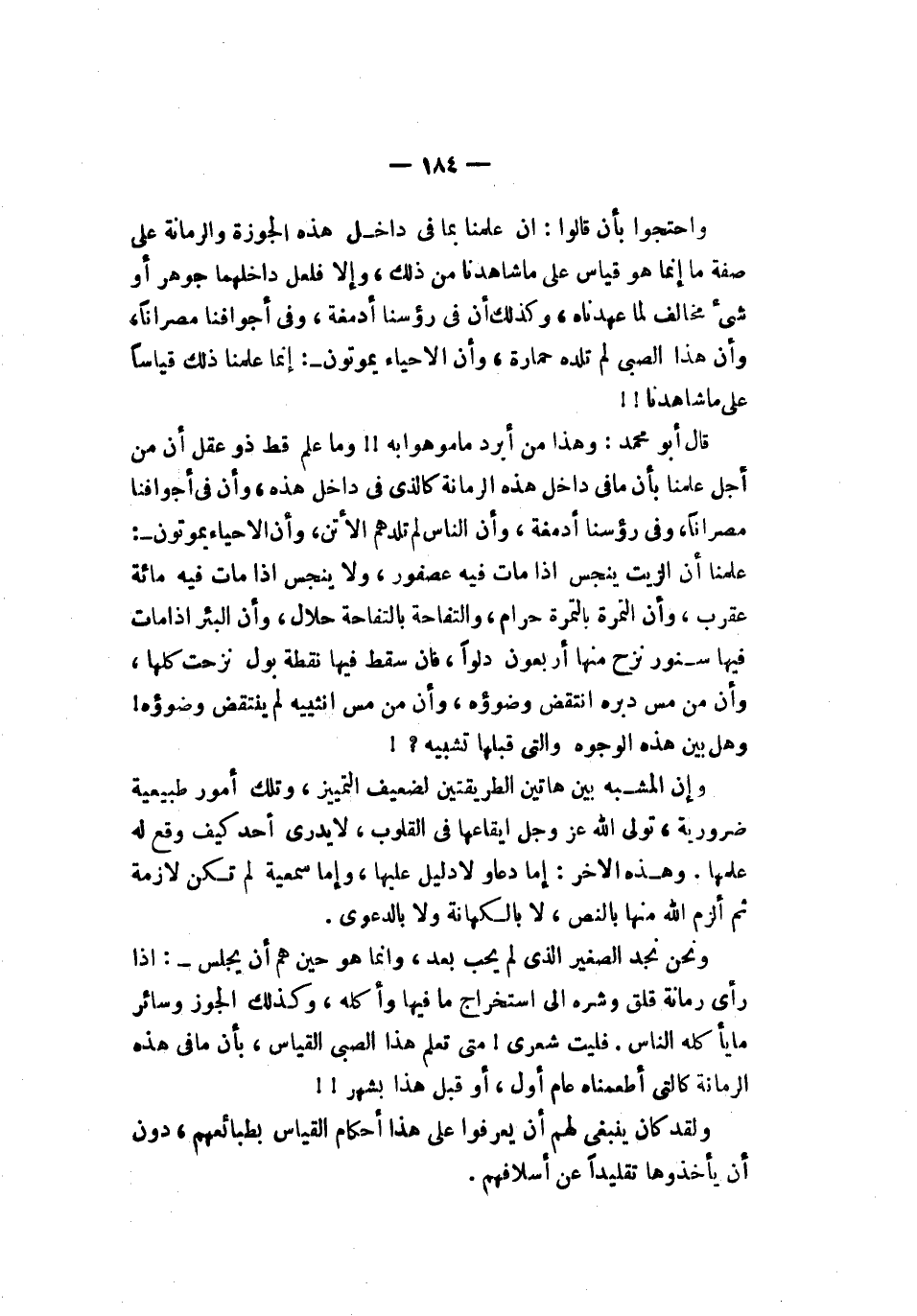واحتجوا بأن قالوا إن علمنا بما في داخل هذه الجوزة والرمانة على صفة ما إنما هو قياس على ما شاهدنا من ذلك وإلا فلعل داخلهما جوهر أو شيء مخالف لما عهدناه وكذلك أن في رؤوسنا أدمغة وفي أجوافنا مصرانا وأن هذا الصبي لم تلده حمارة وأن الأحياء يموتون إنما علمنا ذلك قياسا على ما شاهدنا قال أبو محمد وهذا من أبرد ما موهوا به وما علم قط ذو عقل أن من أجل علمنا بأن ما في داخل هذه الرمانة كالذي في داخل هذه وأن في أجوافنا مصرانا وفي رؤوسنا أدمغة وأن الناس لم تلدهم الأتن وأن الأحياء يموتون علمنا أن الزيت ينجس إذا مات فيه عصفور ولا ينجس إذا مات فيه مائة عقرب وأن التمرة بالتمرة حرام والتفاحة بالتفاحة حلال وأن البئر إذا مات فيها سنور نزح منها أربعون دلوا فإن سقط فيها نقطة بول نزحت كلها وأن من مس دبره انتقض وضوءه وأن من مس أنثييه لم ينتقض وضوءه وهل بين هذه الوجوه والتي قبلها تشبيه وإن المشبه بين هاتين الطريقتين لضعيف التمييز وتلك أمور طبيعية ضرورية تولى الله عز وجل إيقاعها في القلوب لا يدري أحد كيف وقع له علمها وهذه الأخر إما دعاوى لا دليل عليها وإما سمعية لم تكن لازمة ثم ألزم الله منها بالنص لا بالكهانة ولا بالدعوى ونحن نجد الصغير الذي لم يحب بعد وإنما هو حين هم أن يجلس إذا رأى رمانة قلق وشره إلى استخراج ما فيها وأكلها وكذلك الجوز وسائر ما يأكله الناس فليت شعري متى تعلم هذا الصبي القياس بأن ما في هذه الرمانة كالتي أطعمناه عام أول أو قبل هذا بشهر ولقد كان ينبغي لهم أن يعرفوا على هذا أحكام القياس بطبائعهم دون أن يأخذوها تقليدا عن أسلافهم