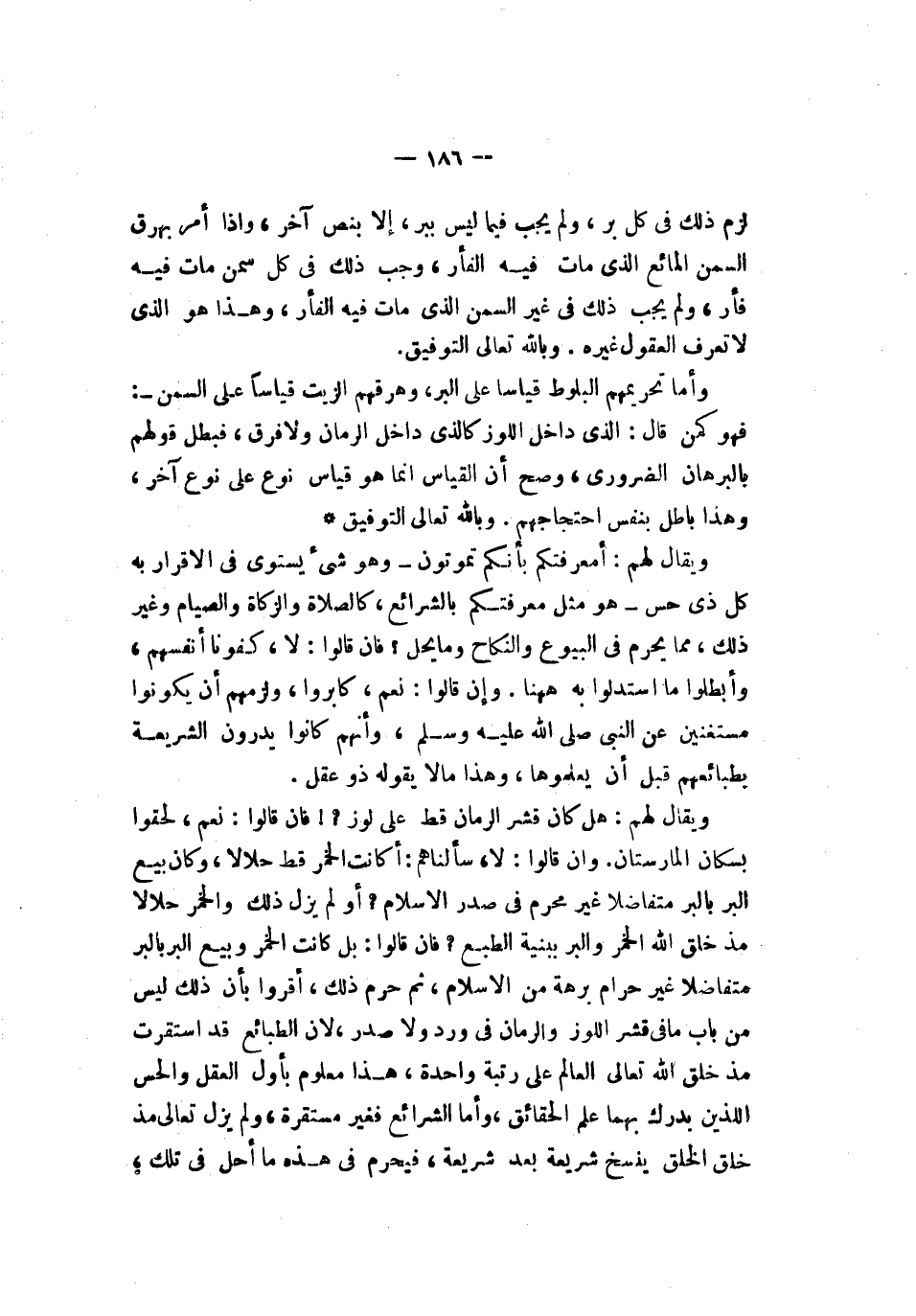 حس هو مثل معرفتكم بالشرائع كالصلاة والزكاة والصيام وغير ذلك مما يحرم في البيوع والنكاح وما يحل فإن قالوا لا كفونا أنفسهم وأبطلوا ما استدلوا به ههنا وإن قالوا نعم كابروا ولزمهم أن يكونوا مستغنين عن النبي صلى الله عليه وسلم وأنهم كانوا يدرون الشريعة بطبائعهم قبل أن يعلموها وهذا ما لا يقوله ذو عقل ويقال لهم هل كان على قشر الرمان قط على لوز فإن قالوا نعم لحقوا بسكان المارستان وإن قالوا لا سألناهم أكانت الخمر قط حلالا وكان بيع البر بالبر متفاضلا غير محرم في صدر الإسلام أو لم يزل ذلك والخمر حلالا مذ خلق الله الخمر وللبر بينة الطبع فإن قالوا كانت الخمر وبيع البر متفاضلا غير حرام برهة من الإسلام ثم حرم ذلك أقروا بأن ذلك ليس من باب ما في قشر اللوز والرمان في ورد ولا صدر لأن الطبائع قد استقرت مذ خلق الله تعالى العالم على رتبة واحدة هذا معلوم بأول العقل والحس اللذين يدرك بهما علم الحقائق وأما الشرائع فغير مستقرة ولم يزل تعالى مذ خلق الخلق ينسخ شريعة بعد شريعة فيحرم في هذه ما أحل في تلك