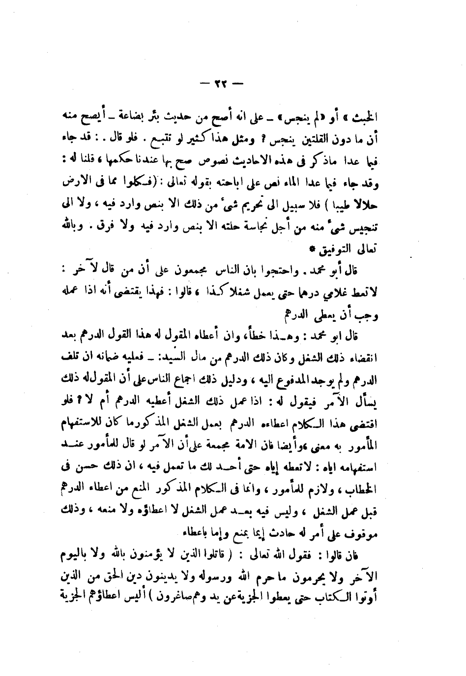 فلا سبيل إلى تحريم شيء من ذلك إلا بنص وارد فيه ولا إلى تنجيس شيء منه من أجل نجاسة حلته إلا بنص وارد فيه ولا فرق وبالله تعالى التوفيق قال أبو محمد واحتجوا بأن الناس مجمعون على أن من قال لآخر لا تعط غلامي درهما حتى يعمل شغلا كذا قالوا فهذا يقتضي أنه إذا عمله وجب أن يعطي الدرهم قال أبو محمد وهذا خطأ وإن أعطاه المقول له هذا القول الدرهم بعد انقضاء ذلك الشغل وكان ذلك الدرهم من مال السيد فعليه ضمانه إن تلف الدرهم ولم يوجد المدفوع إليه ودليل ذلك إجماع الناس على أن المقول له ذلك يسأل الآمر فيقول له إذا عمل ذلك الشغل أعطيه الدرهم أم لا فلو اقتضى هذا الكلام إعطاءه الدرهم بعمل الشغل المذكور ما كان للاستفهام المأمور به معنى وأيضا فإن الأمة مجمعة على أن الآمر لو قال للمأمور عند استفهامه إياه لا تعطه إياه حتى أجد لك ما تعمل فيه أن ذلك حسن في الخطاب ولازم للمأمور وإنما في الكلام المذكور المنع من إعطاء الدرهم قبل عمل الشغل وليس فيه بعد عمل الشغل لا إعطاؤه ولا منعه وذلك موقوف على أمر له حادث إما بمنع وإما بإعطاء فإن قالوا فقول الله تعالى {قاتلوا لذين لا يؤمنون بلله ولا بليوم لآخر ولا يحرمون ما حرم لله ورسوله ولا يدينون دين لحق من لذين أوتوا لكتاب حتى يعطوا لجزية عن يد وهم صاغرون} أليس إعطاؤهم الجزية