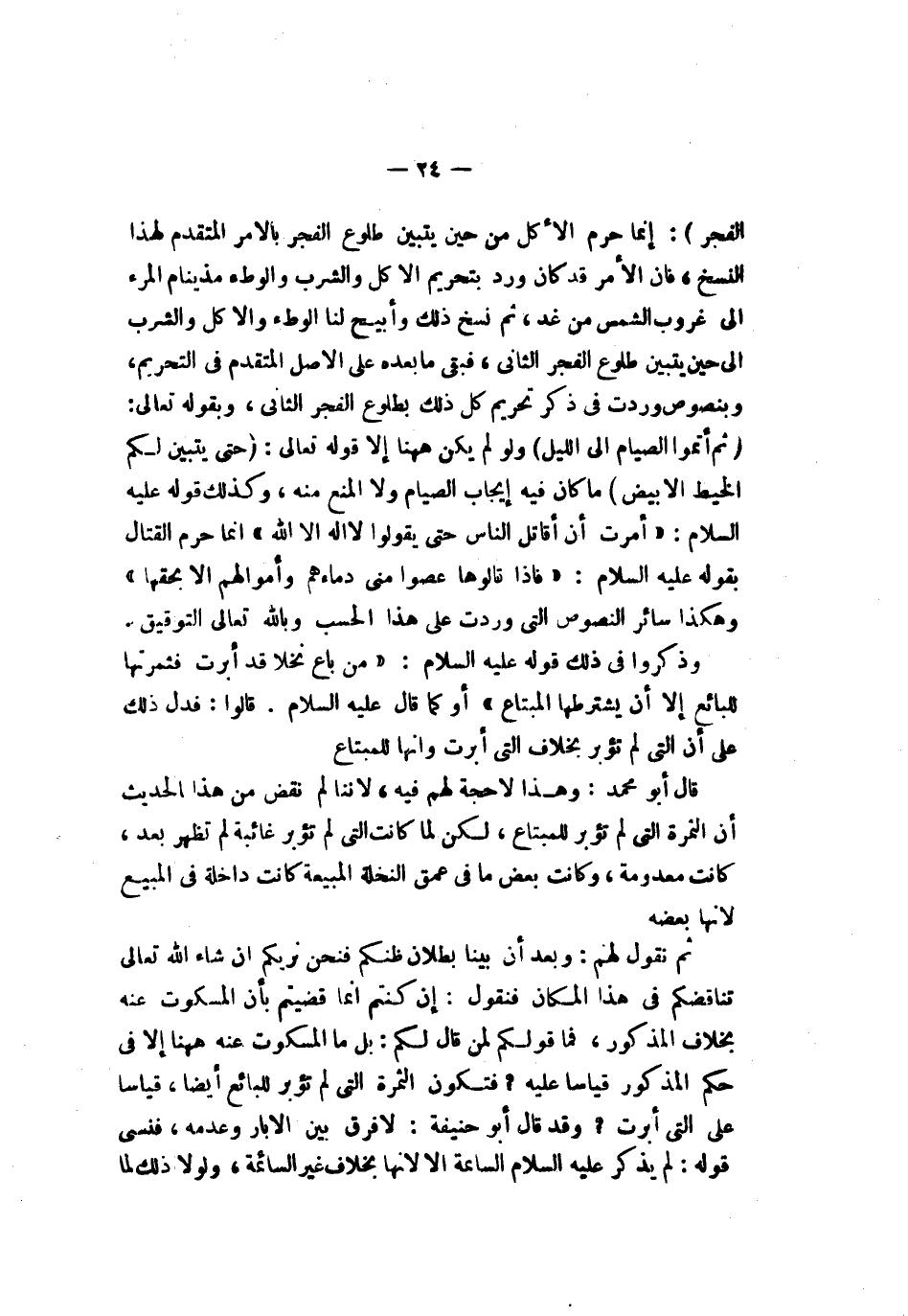 المتقدم في التحريم وبنصوص وردت في ذكر تحريم كل ذلك بطلوع الفجر الثاني وبقوله تعالى {أحل لكم ليلة لصيام لرفث إلى نسآئكم هن لباس لكم وأنتم لباس لهن علم لله أنكم كنتم تختانون أنفسكم فتاب عليكم وعفا عنكم فلآن باشروهن وبتغوا ما كتب لله لكم وكلوا وشربوا حتى يتبين لكم لخيط لأبيض من لخيط لأسود من لفجر ثم أتموا لصيام إلى لليل ولا تباشروهن وأنتم عاكفون في لمساجد تلك حدود لله فلا تقربوها كذلك يبين لله آياته للناس لعلهم يتقون} ولو لم يكن ههنا إلا قوله تعالى {أحل لكم ليلة لصيام لرفث إلى نسآئكم هن لباس لكم وأنتم لباس لهن علم لله أنكم كنتم تختانون أنفسكم فتاب عليكم وعفا عنكم فلآن باشروهن وبتغوا ما كتب لله لكم وكلوا وشربوا حتى يتبين لكم لخيط لأبيض من لخيط لأسود من لفجر ثم أتموا لصيام إلى لليل ولا تباشروهن وأنتم عاكفون في لمساجد تلك حدود لله فلا تقربوها كذلك يبين لله آياته للناس لعلهم يتقون} ما كان فيه إيجاب الصيام ولا المنع منه وكذلك قوله صلى الله عليه وسلم أمرت أن أقاتل الناس حتى يقولوا لا إله إلا الله إنما حرم القتال بقوله صلى الله عليه وسلم فإذا قالوها عصموا مني دماؤهم وأموالهم إلا بحقها وهكذا سائر النصوص التي وردت على هذا الحسب وبالله تعالى التوفيق