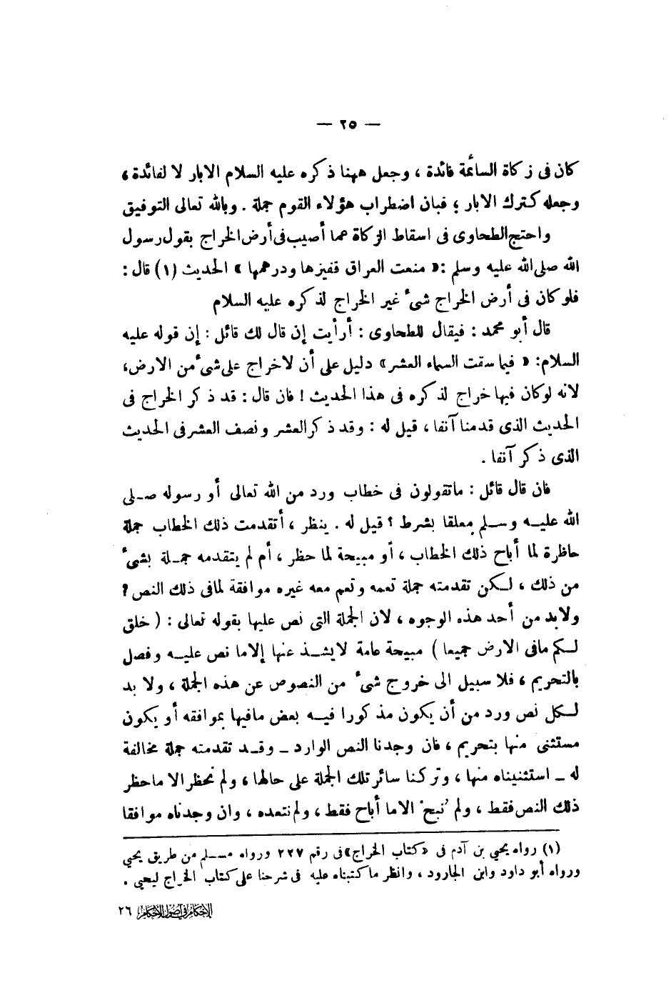 كان في زكاة السائمة فائدة وجعل ههنا ذكره صلى الله عليه وسلم الإبار لا لفائدة وجعله كترك الإبار فبان اضطراب هؤلاء القوم جملة وبالله تعالى التوفيق واحتج الطحاوي في إسقاط الزكاة عما أصيب في أرض الخراج بقول رسول الله صلى الله عليه وسلم منعت العراق قفيزها ودرهمها الحديث قال فلو كان في أرض الخراج شيء غير الخراج لذكره صلى الله عليه وسلم قال أبو محمد فيقال للطحاوي أرأيت إن قال لك قائل إن قوله صلى الله عليه وسلم فيما سقت السماء العشر دليل على أن لا خراج على شيء من الأرض لأنه لو كان فيها خراج لذكره في هذا الحديث فإن قال قد ذكر الخراج في الحديث الذي قدمنا آنفا قيل له وقد ذكر العشر ونصف العشر في الحديث الذي ذكر آنفا فإن قال قائل ما تقولون في خطاب ورد من الله تعالى أو رسوله صلى الله عليه وسلم معلقا بشرط قيل له ينظر أتقدمت ذلك الخطاب جملة حاظرة لما أباح ذلك الخطاب أو مبيحة لما حظر أم لم يتقدمه جملة