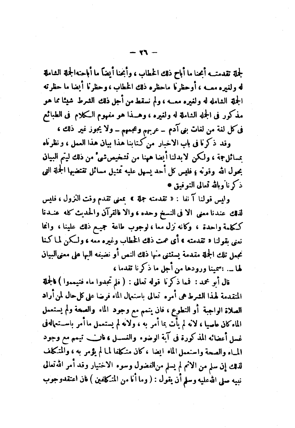 لجملة تقدمته أبحنا ما أباح ذلك الخطاب وأبحنا أيضا ما أباحته الجملة الشاملة له ولغيره معه أو حظرنا ما حظره لك الخطاب وحظرنا أيضا ما حظرته الجملة الشاملة له ولغيره معه ولم نسقط من أجل ذلك الشرط شيئا مما هو مذكور في الجملة الشاملة له ولغيره وهذا هو مفهوم الكلام في الطبائع في كل لغة من لغات بني آدم عربهم وعجمهم ولا يجوز غير ذلك وقد ذكرنا في باب الأخبار من كتابنا هذا بيان هذا العمل ونظرناه بمسائل جمة ولكن لا بد لنا أيضا ههنا من تشخيص شيء من ذلك ليتم البيان بحول الله وقوته فليس كل أحد يسهل عليه تمثيل مسائل تقضيها الجملة التي ذكرنا وبالله تعالى التوفيق وليس قولنا آنفا تقدمته جملة بمعنى تقدم وقت النزول فليس لذلك عندنا معنى إلا في النسخ وحده وإلا فالقرآن والحديث كله عندنا ككلمة واحدة وكأنه نزل معا لوجوب طاعة جميع ذلك علينا وإنما نعني بقولنا تقدمته أي عمت ذلك الخطاب وغيره معه ولكن لما كنا نجعل تلك الجملة مقدمة يستثنى منها ذلك النص أو نضيفه إليها على معنى البيان لها سمينا ورودها من أجل ما ذكرنا تقدما قال أبو محمد فمما ذكرنا قوله تعالى {يا أيها لذين آمنوا إذا قمتم إلى لصلاة فغسلوا وجوهكم وأيديكم إلى لمرافق