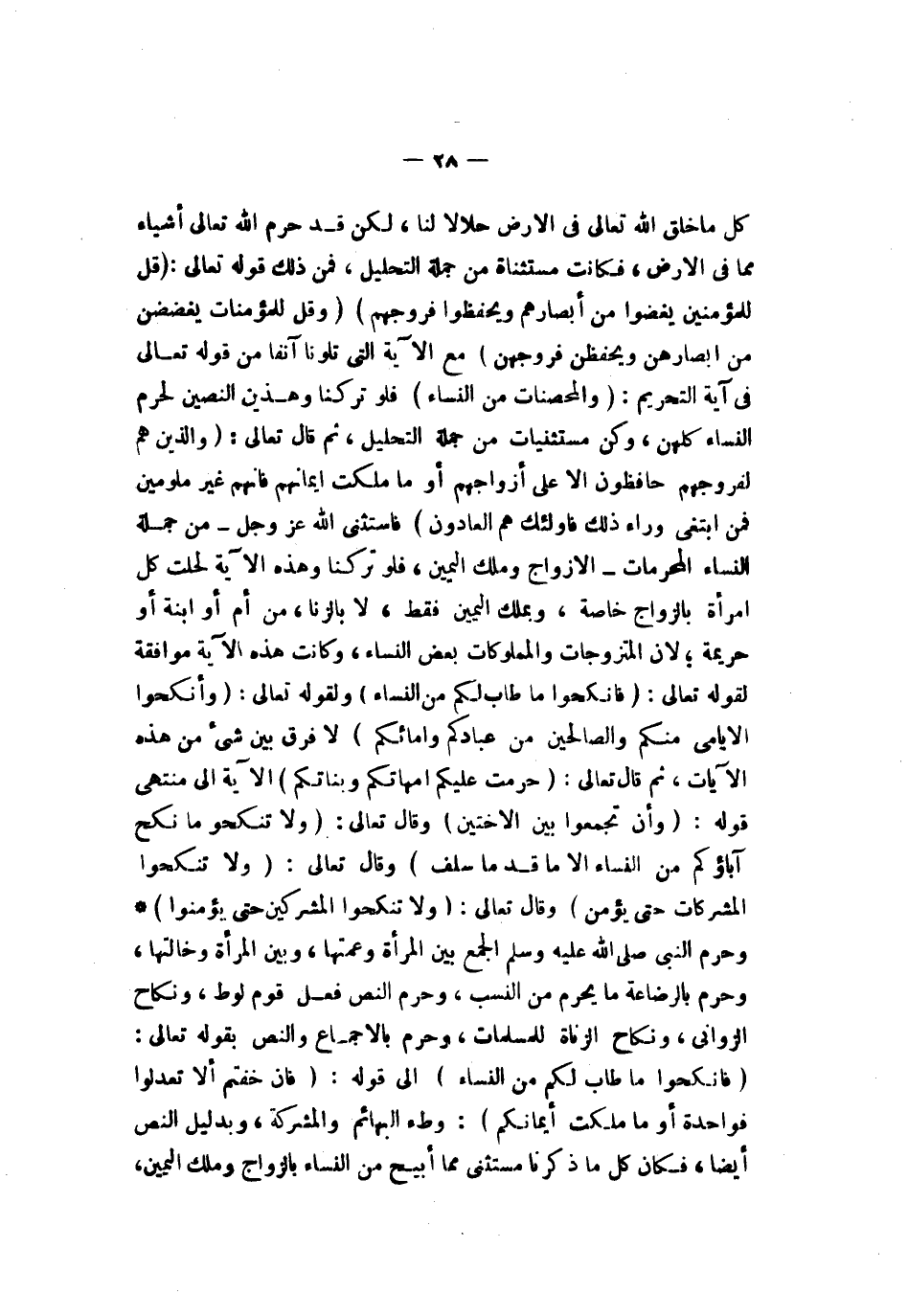 كل ما خلق الله تعالى في الأرض حلالا لنا لكن حرم الله تعالى أشياء مما في الأرض فكانت مستثناة من جملة التحليل فمن ذلك قوله تعالى {قل للمؤمنين يغضوا من أبصارهم ويحفظوا فروجهم} {وقل للمؤمنات يغضضن من أبصارهن ويحفظن فروجهن} مع الآية التي تلونا آنفا من قوله تعالى في آية التحريم {والمحصنات من النساء} فلو تركنا وهذين النصين لحرم النساء كلهن وكن مستثنيات من جملة التحليل ثم قال تعالى {والذين هم لفروجهم حافظون إلا على أزواجهم أو ما ملكت أيمانهم فإنهم غير ملومين فمن ابتغى وراء ذلك فأولئك هم العادون} فاستثنى الله عز وجل من جملة النساء المحرمات الأزواج وملك اليمين فلو تركنا وهذه الآية لحلت كل امرأة بالزواج خاصة وبملك اليمين فقط لا بالزنى من أم أو إبنة أو حريمة لأن المتزوجات والمملوكات بعض النساء وكانت هذه الآية موافقة لقوله تعالى {فانكحوا ما طاب لكم من النساء} ولقوله تعالى {وأنكحوا الأيامى منكم والصالحين من عبادكم وإمائكم} ولا فرق بين شيء من هذه الآيات ثم قال تعالى {حرمت عليكم أمهاتكم وبناتكم} الآية إلى منتهى قوله {وأن تجمعوا بين الاختين} وقال تعالى {ولا تنكحوا ما نكح آباؤكم من النساء إلا ما قد سلف} وقال تعالى {ولا تنكحوا المشركات حتى يؤمن} وقال تعالى {ولا تنكحوا المشركين حتى يؤمنوا}