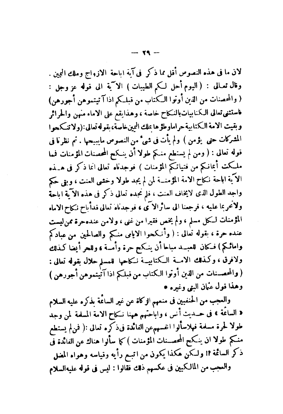 وكذلك الأمة الكتابية نكاحها للمسلم حلال بقوله تعالى {ليوم أحل لكم لطيبات وطعام لذين أوتوا لكتاب حل لكم وطعامكم حل لهم ولمحصنات من لمؤمنات ولمحصنات من لذين أوتوا لكتاب من قبلكم إذآ آتيتموهن أجورهن محصنين غير مسافحين ولا متخذي أخدان ومن يكفر بلإيمان فقد حبط عمله وهو في لآخرة من لخاسرين} وهذا قول عثمان البتي وغيره والعجب من الحنفيين في منعهم الزكاة عن غير السائمة بذكره صلى الله عليه وسلم السائمة في حديث أنس وإباحتهم ههنا نكاح الأمة المسلمة لمن وجد طولا لحرة مسلمة فهلا سألوا أنفسهم عن الفائدة في ذكره تعالى {ومن لم يستطع منكم طولا أن ينكح لمحصنات لمؤمنات فمن ما ملكت أيمانكم من فتياتكم لمؤمنات ولله أعلم بإيمانكم بعضكم من بعض فنكحوهن بإذن أهلهن وآتوهن أجورهن بلمعروف محصنات غير مسافحات ولا متخذات أخدان فإذآ أحصن فإن أتين بفاحشة فعليهن نصف ما على لمحصنات من لعذاب ذلك لمن خشي لعنت منكم وأن تصبروا خير لكم ولله غفور رحيم} كما سألوا هناك عن الفائدة في ذكر السائمة ولكن هكذا يكون من اتبع رأيه وقياسه وهواه المضل والعجب من المالكيين في عكسهم ذلك فقالوا ليس في قوله صلى الله عليه وسلم