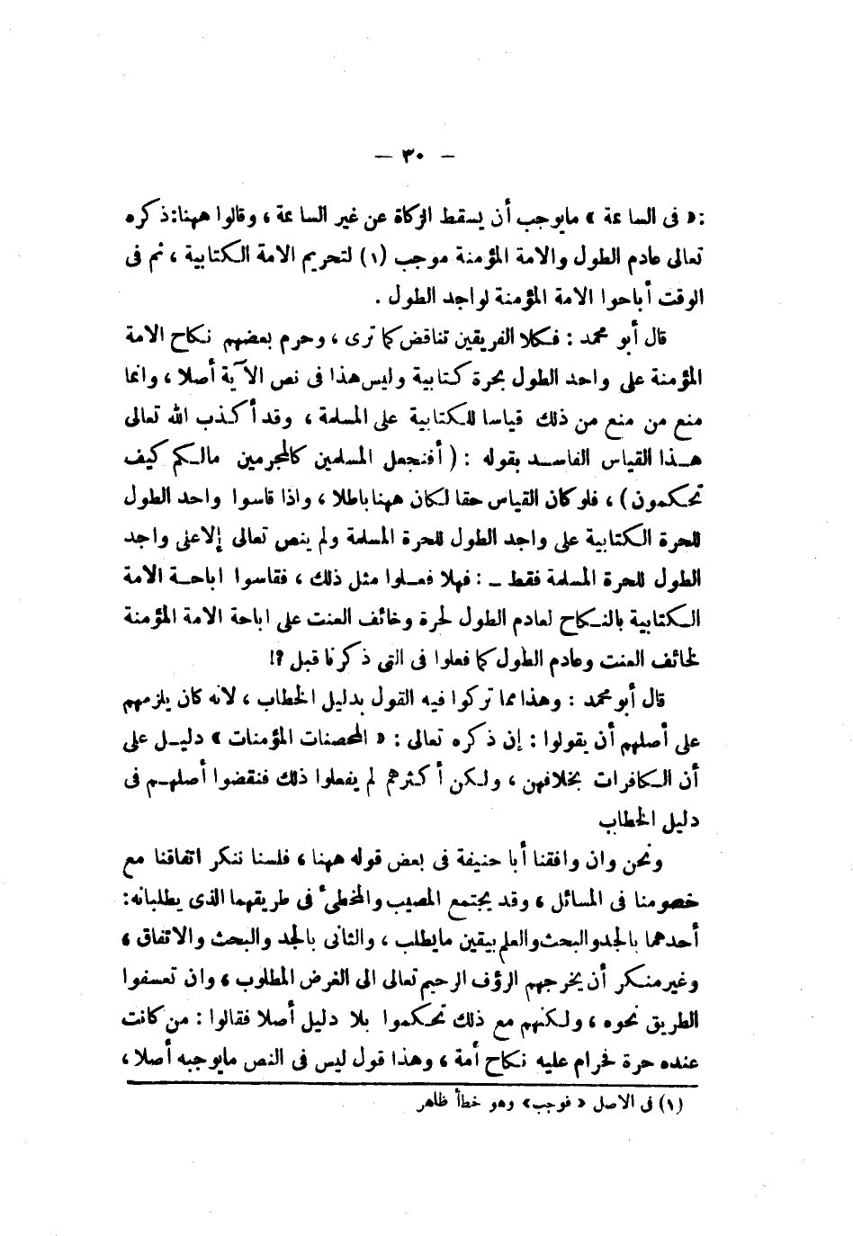 في السائمة ما يوجب أن يسقط الزكاة من غير السائمة وقالوا ههنا ذكره تعالى عادل الطول والأمة المؤمنة موجب التحريم الأمة الكتابية ثم في الوقت أباحوا الأمة المؤمنة لواجد الطول قال أبو محمد فكلا الفريقين تناقض كما ترى وحرم بعضهم نكاح الأمة المؤمنة على واجد الطول بحرة كتابية وليس هذا في نص الآية أصلا وإنما منع من منع من ذلك قياسا للكتابية على المسلمة وقد أكذب الله تعالى هذا القياس الفاسد بقوله {أفنجعل لمسلمين كلمجرمين * ما لكم كيف تحكمون} فلو كان القياس حقا لكان هنا باطلا وإذا قاسوا واجد الطول للحرة الكتابية على واجد الطول للحرة المسلمة ولم ينص تعالى إلا على واجد الطول للحرة المسلمة فقط فهلا فعلوا مثل ذلك فقاسوا