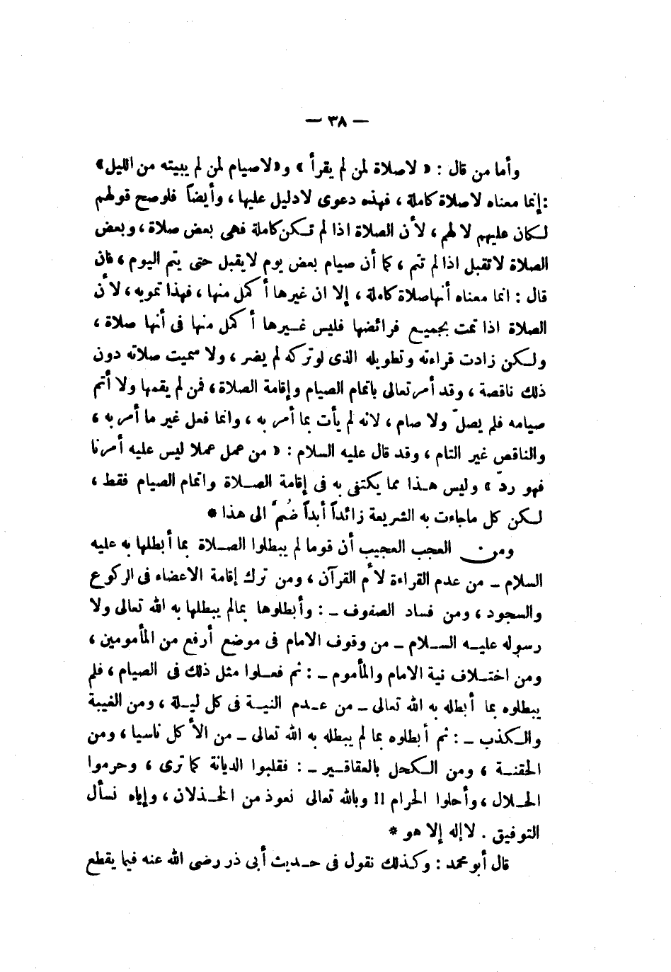 وأما من قال لا صلاة لمن لم يقرأ ولا صيام لمن لن يبيته من الليل إنما معناه لا صلاة كاملة فهذه دعوى لا دليل عليها وأيضا فلو صح قولهم لكان عليهم لا لهم لأن الصلاة إذا لم تكن كاملة فهي بعض صلاة وبعض الصلاة لا تقبل إذا لم تتم كما أن صيام بعض يوم لا يقبل حتى يتم اليوم فإن قال إنما معناه أنها صلاة كاملة إلا أن غيرها أكمل منها فهذا تمويه لأن الصلاة إذا تمت بجميع فرائضها فليس غيرها أكمل منها في أنها صلاة ولكن زادت قراءته وتطويله الذي لو تركه لم يضر ولا سميت صلاته دون ذلك ناقصة وقد أمر تعالى بإتمام الصيام وإقامة الصلاة فمن لم يقمها ولا أتم صيامه فلم يصل ولا صام لأنه لم يأت بما أمر به وإنما فعل غير ما أمر به والناقص غير التام وقد قال صلى الله عليه وسلم من عمل عملا ليس عليه أمرنا فهو رد وليس هذا مما يكتفى به في إقامة الصلاة وإتمام الصيام فقط لكن كل ما جاءت به الشريعة زائدا أبدا ضم إلى هذا ومن العجب العجيب أن قوما لم يبطلوا الصلاة بما أبطلها به صلى الله عليه وسلم من عدم القراءة لأم القرآن ومن ترك إقامة الأعضاء في الركوع والسجود ومن فساد الصفوف وأبطلوها بما لم يبطلها به الله تعالى ولا رسوله صلى الله عليه وسلم من وقوف الإمام في موضع أرفع من المأمومين ومن اختلاف نية الإمام والمأموم ثم فعلوا مثل ذلك في الصيام فلم يبطلوه بما أبطله به الله تعالى من عدم النية في كل ليلة ومن الغيبة والكذب ثم أبطلوه بما لم يبطله به الله تعالى من الأكل ناسيا ومن الحقنة ومن الكحل بالعقاقير فقلبوا الديانة كما ترى وحرموا الحلال وأحلوا الحرام وبالله تعالى نعوذ من الخذلان وإياه نسأل التوفيق لا إله إلا هو قال أبو محمد وكذلك نقول في حديث أبي ذر رضي الله عنه فيما يقطع