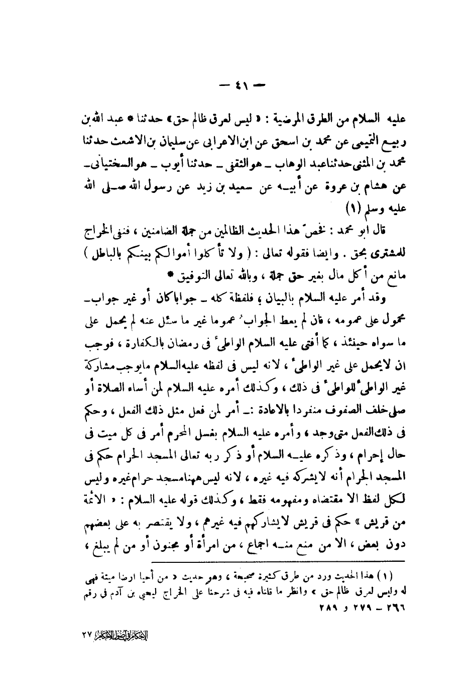 صلى الله عليه وسلم من الطريق المرضية ليس لعرق ظالم حق حدثنا عبد الله بن ربيع التميمي عن محمد بن إسحاق عن ابن الأعرابي عن سليمان بن الأشعث حدثنا محمد بن المثنى حدثنا عبد الوهاب هو الثقفي حدثنا أيوب هو السختياني عن هشام بن عروة عن أبيه عن سعيد بن زيد عن رسول الله صلى الله عليه وسلم قال أبو محمد فخص هذا الحديث الظالمين من جملة الضامنين فنفى الخراج للمشتري بحق وأيضا فقوله تعالى {ولا تأكلوا أموالكم بينكم بلباطل وتدلوا بها إلى لحكام لتأكلوا فريقا من أموال لناس بلإثم وأنتم تعلمون} مانع من أكل مال بغير حق جملة وبالله تعالى التوفيق وقد أمر صلى الله عليه وسلم بالبيان فلفظه كله جوابا كان أو غير جواب محمول على عمومه فإن لم يعط الجواب عموما غير ما سئل عنه لم يحمل على ما سواه حينئذ كما أفتى صلى الله عليه وسلم الواطىء في رمضان بالكفارة فوجب ألا يجعل على