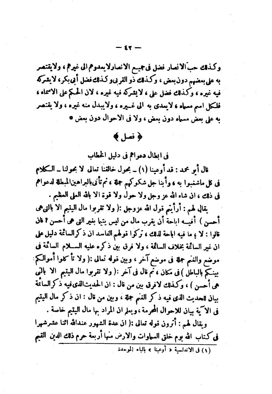 وكذلك حب الأنصار فضل في جميع الأنصار لا يعدوهم إلى غيرهم ولا يقتصر به على بعضهم دون بعض وكذلك ذو القربى وكذلك فضل أبي بكر لا يشركه فيه غيره وكذلك فضل علي لا يشركه فيه غيره لأن الحكم على الأسماء فكل اسم مسماه لا يعدي به إلى غيره ولا يبدل منه غيره ولا يقتصر به على بعض مسماه دون بعض ولا في الأحوال دون بعض