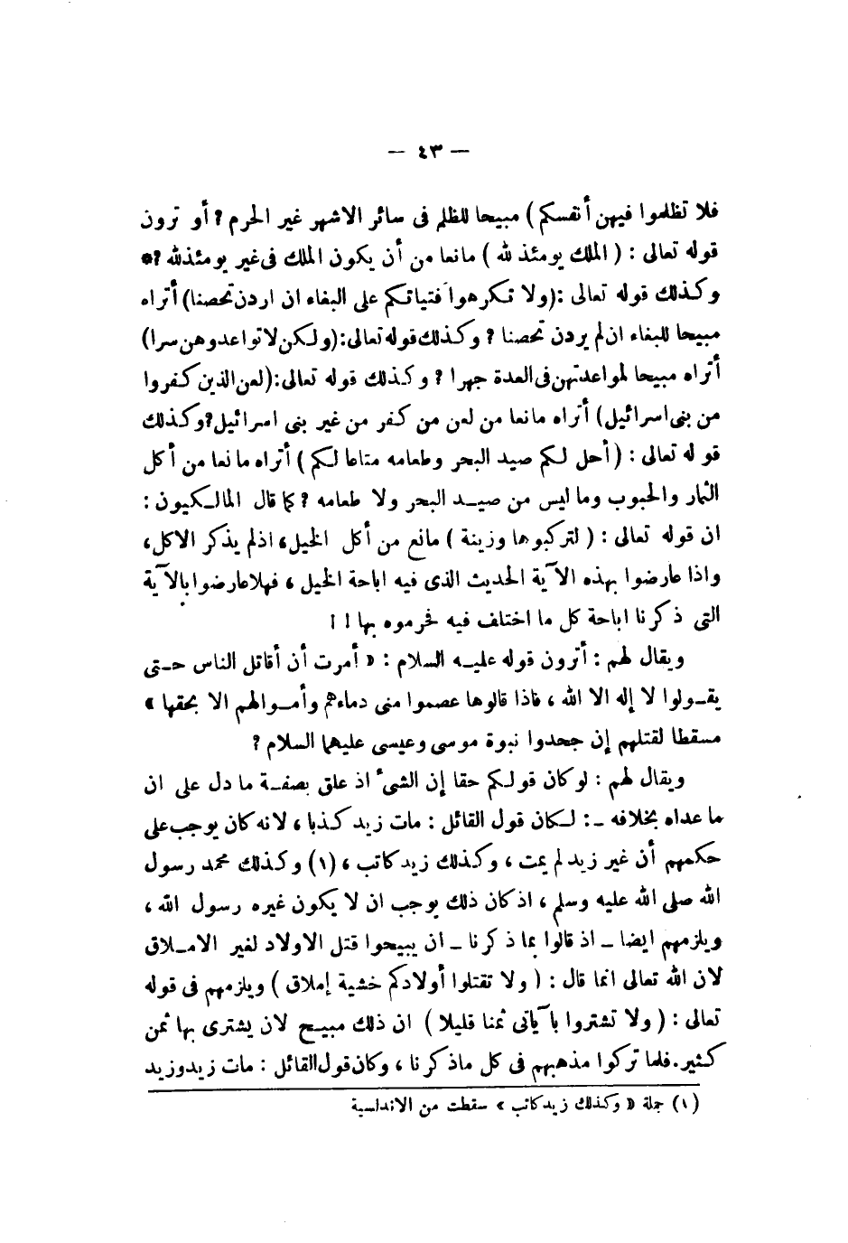 فلا تظلموا فيهن أنفسكم وقاتلوا لمشركين كآفة كما يقاتلونكم كآفة وعلموا أن لله مع لمتقين} مبيحا للظلم في سائر الأشهر غير الحرم أو ترون قوله تعالى {لملك يومئذ لله يحكم بينهم فلذين آمنوا وعملوا لصالحات في جنات لنعيم} مانعا من أن يكون الملك في غير يومئذ لله وكذلك قوله تعالى {وليستعفف لذين لا يجدون نكاحا حتى يغنيهم لله من فضله ولذين يبتغون الكتاب مما ملكت أيمانكم فكاتبوهم إن علمتم فيهم خيرا وآتوهم من مال لله لذي آتاكم ولا تكرهوا فتياتكم على لبغآء إن أردن تحصنا لتبتغوا عرض لحياة لدنيا ومن يكرههن فإن لله من بعد إكراههن غفور رحيم} أتراه مبيحا للبغاء إن لم يردن تحصنا وكذلك قوله تعالى {ولا جناح عليكم فيما عرضتم به من خطبة لنسآء أو أكننتم في أنفسكم علم لله أنكم ستذكرونهن ولكن لا تواعدوهن سرا إلا أن تقولوا قولا معروفا ولا تعزموا عقدة لنكاح حتى يبلغ لكتاب أجله وعلموا أن لله يعلم ما في أنفسكم فحذروه وعلموا أن لله غفور حليم} أتراه مبيحا لمواعدتهن في العدة جهرا وكذلك قوله تعالى {لعن لذين كفروا من بني إسرائيل على لسان داوود وعيسى بن مريم ذلك بما عصوا وكانوا يعتدون} أتراه مانعا من لعن من كفر من غير بني إسرائيل وكذلك قوله تعالى {أحل لكم صيد لبحر وطعامه متاعا لكم وللسيارة وحرم عليكم صيد لبر ما دمتم حرما وتقوا لله لذي إليه تحشرون} أتراه مانعا من أكل الثمار والحبوب وما ليس من صيد البحر ولا طعامه كما قال المالكيون إن قوله تعالى {ولخيل ولبغال ولحمير لتركبوها وزينة ويخلق ما لا