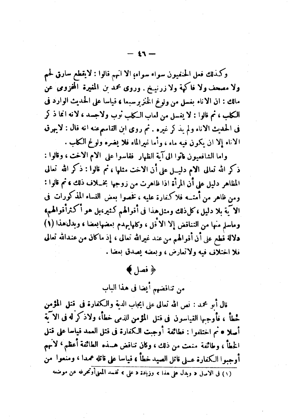 فصل من تناقضهم في ذلك أيضا قال أبو محمد نص الله تعالى على إيجاب الدية والكفارة في قتل المؤمن خطأ فأوجبها القياسيون في قتل المؤمن الذمي خطأ ولا ذكر له في الآية أصلا ثم اختلفوا فطائفة أوجبت الكفارة في قتل العمد قياسا على قتل الخطأ وطائفة منعت من ذلك وكان تناقض هذه الطائفة أعظم لأنهم أوجبوا الكفارة على قاتل الصيد خطأ قياسا على قاتله عمدا ومنعوا