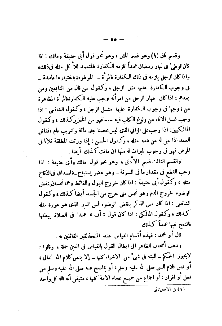 الوضوء فمس الدبر الذي هو عورة مثله كذلك وكقول المالكي إذا كان قول أف عمدا في الصلاة يبطلها فالنفخ فيها عمدا كذلك قال أبو محمد فهذه أقسام القياس عند المتحذلقين القائلين به وذهب أصحاب الظاهر إلى إبطال القول بالقياس في الدين جملة وقالوا لا يجوز الحكم البتة في شيء من الأشياء كلها إلا بنص كلام الله تعالى أو نص كلام النبي صلى الله عليه وسلم أو بما صح عنه صلى الله عليه وسلم من فعل أو إقرار أو إجماع من جميع علماء الأمة كلها متيقن أنه قاله كل واحد