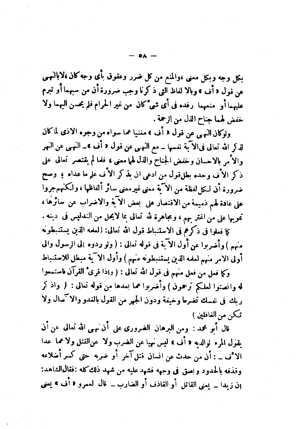 قال أبو محمد ومن البرهان الضروري على أن نهي الله تعالى عن أن يقول المرء لوالديه ليس نهيا عن الضرب ولا عن القتل ولا عما عدا الأف أن من حدث عن إنسان قتل آخر أو ضربه حتى كسر أضلاعه وقذفه بالحدود وبصق في وجهه فشهد عليه من شهد ذلك كله فقال الشاهد إن زيدا يعني القاتل أو القاذف أو الضارب قال لعمرو يعني