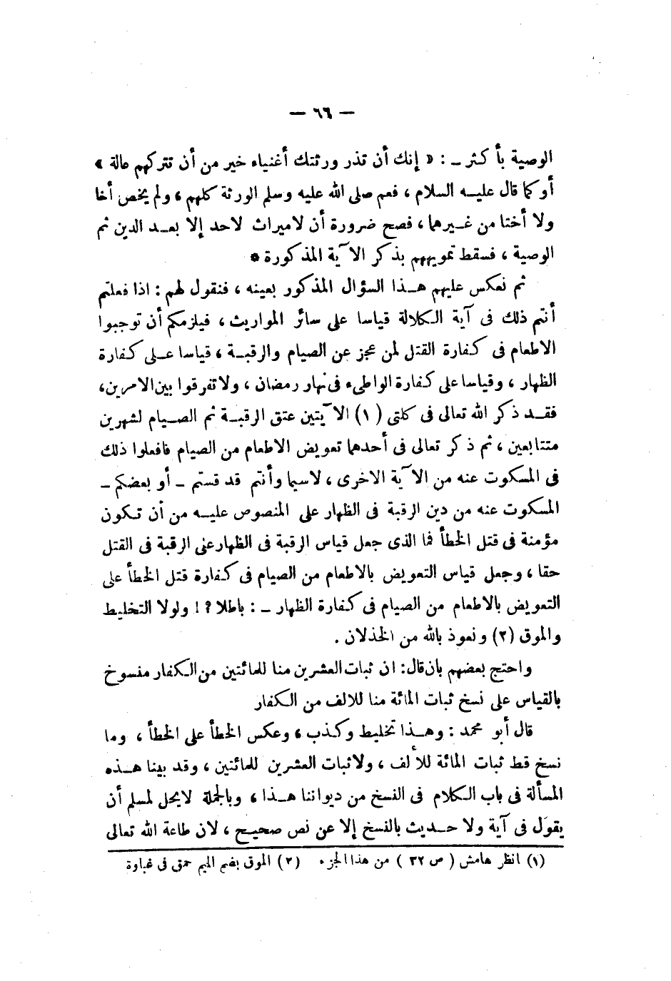 ثم نعكس عليهم هذا السؤال المذكور بعينه فنقول لهم إذا فعلتم أنتم ذلك في آية الكلالة قياسا على سائر المواريث فيلزمكم أن توجبوا الإطعام في كفارة القتل لمن عجز عن الصيام والرقبة قياسا على كفارة الظهار وقياسا على كفارة الواطىء في نهار رمضان ولا تفرقوا بين الأمرين فقد ذكر الله تعالى في كلتا الآيتين عتق الرقبة ثم الصيام لشهرين متتابعين ثم ذكر تعالى في أحدهما تعويض الإطعام من الصيام فافعلوا ذلك في المسكوت عنه من الآية الأخرى لا سيما وأنتم قد قستم أو بعضكم المسكوت عنه من دين الرقبة في الظهار على المنصوص عليه من أن تكون مؤمنة في قتل الخطأ فما الذي جعل قياس الرقبة في الظهار على التعويض في القتل حقا وجعل قياس التعويض بالإطعام من الصيام في كفارة قتل الخطأ على التعويض بالإطعام من الصيام في كفارة الظهار باطلا ولولا التخليط والموق ونعوذ بالله من الخذلان واحتج بعضهم بأن قال إن ثبات العشرين منا للمائتين من الكفار منسوخ بالقياس على نسخ ثبات المائة منا للألف من الكفار قال أبو محمد وهذا تخليط وكذب وعكس الخطأ على الخطأ وما نسخ قط ثبات المائة للألف ولا ثبات العشرين للمائتين وقد بينا هذه المسألة في باب الكلام في النسخ من ديواننا هذا وبالجملة لا يحل لمسلم أن يقول في آية ولا حديث بالنسخ إلا عن نص صحيح لأن طاعة الله