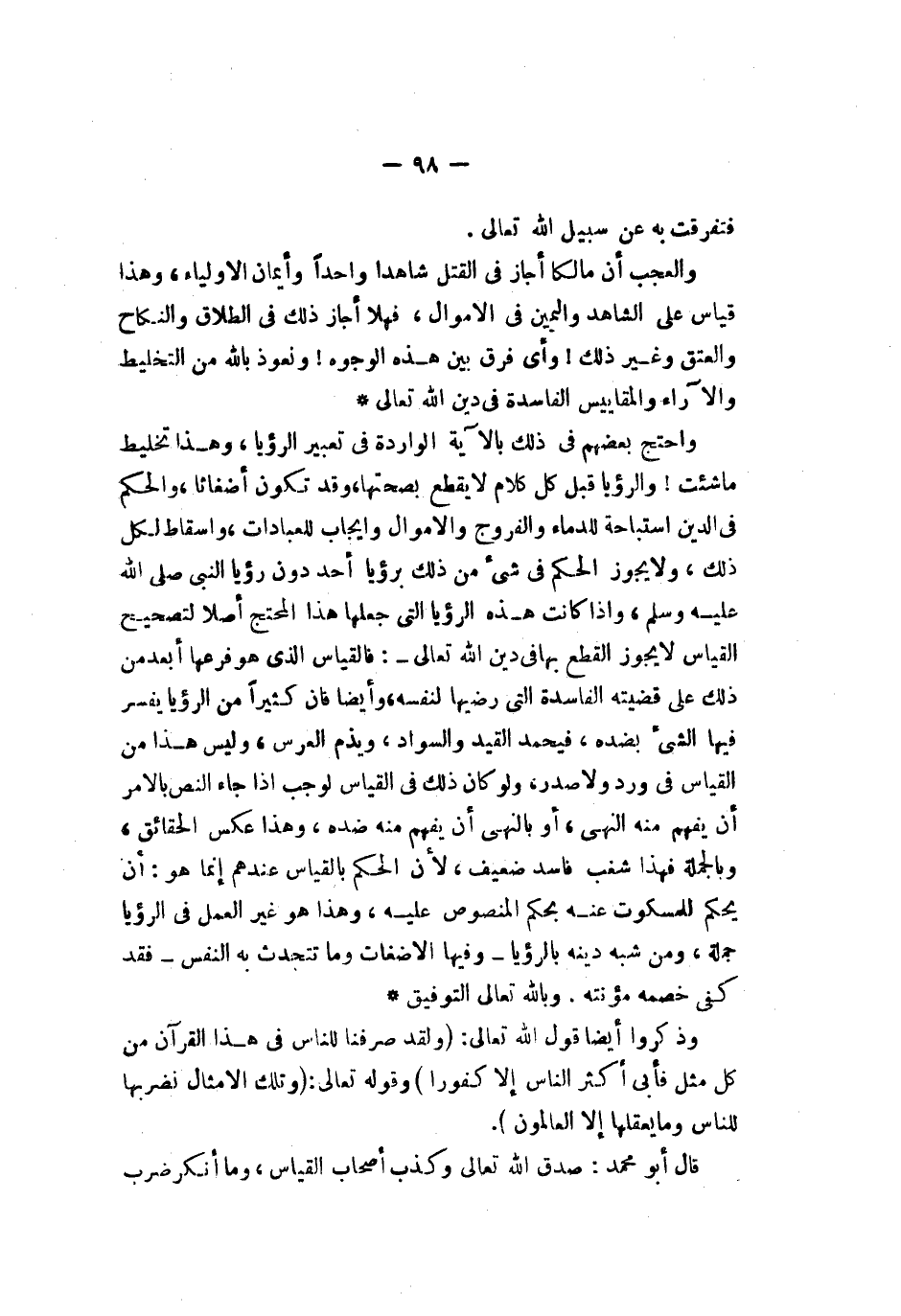 دينه بالرؤيا وفيها الأضغاث وما تتحدث به النفس فقد كفى خصمه مؤنته وبالله تعالى التوفيق وذكروا أيضا قول الله تعالى {ولقد صرفنا للناس في هذا لقرآن من كل مثل فأبى أكثر لناس إلا كفورا} وقوله تعالى {وتلك لأمثال نضربها للناس وما يعقلهآ إلا لعالمون} قال أبو محمد صدق الله تعالى وكذب أصحاب القياس وما أنكر ضرب