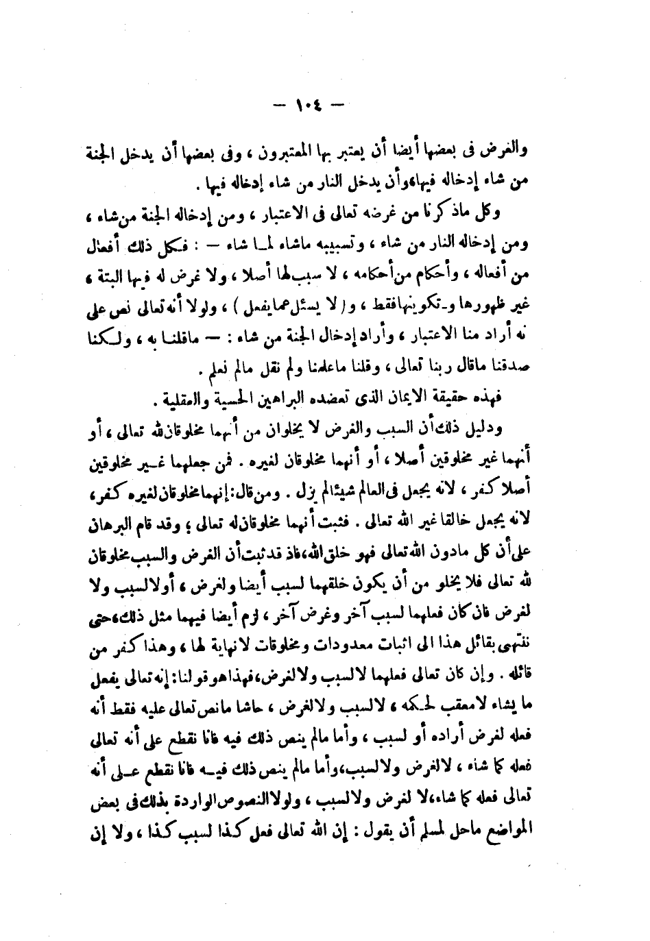 ودليل ذلك أن السبب والغرض لا يخلوان من أنهما مخلوقان لله تعالى أو أنهما غير مخلوقين أصلا أو أنهما مخلوقان لغيره فمن جعلهما غير مخلوقين أصلا كفر لأنه يجعل في العالم شيئا لم يزل ومن قال إنهما مخلوقان لغير كفر لأنه يجعل خالقا غير الله تعالى فثبت أنهما مخلوقان له تعالى وقد قام البرهان على أن كل ما دون الله تعالى فهو خلق الله فإذا قد ثبت أن الغرض والسبب مخلوقان لله تعالى فلا يخلو من أن يكون خلقهما لسبب أيضا ولغرض أو لا لسبب ولا لغرض فإن كان فعلها لسبب آخر وغرض آخر لزم أيضا فيهما مثل ذلك حتى تنتهي بقائل هذا إلى إثبات معدودات ومخلوقات لا نهاية لها وهذا كفر من قائله وإن كان تعالى فعلهما لا لسبب ولا لغرض فهذا هو قولنا إنه تعالى يفعل ما يشاء لا معقب لحكمه لا لسبب ولا لغرض حاشا ما نص تعالى عليه فقط أنه فعله للغرض أراده أو لسبب وأما ما لم ينص ذلك فيه فإنا نقطع على أنه تعالى فعله كما شاء لا لغرض ولا لسبب ولولا النصوص الواردة بذلك في بعض المواضع ما حل لمسلم أن يقول إن الله تعالى فعل كذا لسبب كذا ولا إن