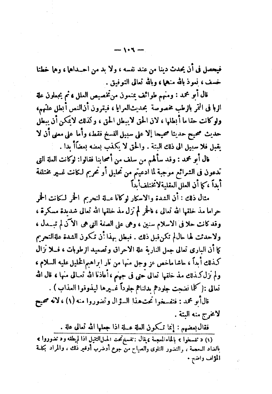 وقد كانت حلال في الإسلام سنين وهي على الصفة هي الآن لم تبدل ولا حدثت لها حال لم تكن قبل ذلك فبطل بهذا أن تكون الشدة علة التحريم كما أن الباري تعالى جعل النارية علة الإحراق وتصعيد الرطوبات فلا تزال كذلك أبدا حاشا ما خص عز وجل منها من نار إبراهيم الخليل عليه السلام ولم تزل كذلك مذ خلقها تعالى حتى في جهنم أعاذنا الله تعالى منها قال الله تعالى {إن لذين كفروا بآياتنا سوف نصليهم نارا كلما نضجت جلودهم بدلناهم جلودا غيرها ليذوقوا لعذاب إن لله كان عزيزا حكيما}