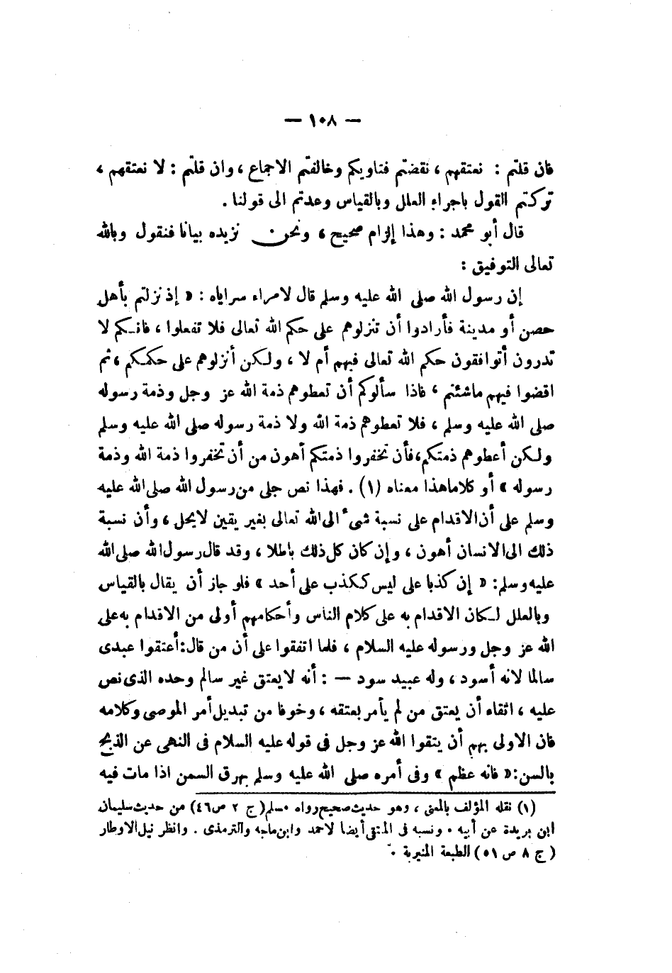 قال أبو محمد وهذا إلزام صحيح ونحن نزيده بيانا فنقول وبالله تعالى التوفيق إن رسول الله صلى الله عليه وسلم قال لأمراء سراياه إذا نزلتم بأهل حصن أو مدينة أرادوا أن تنزلوهم على حكم الله تعالى فلا تفعلوا فإنكم لا تدرون أتوافقون حكم الله تعالى فيهم أم لا ولكن أنزلوهم على حكمكم ثم اقضوا فيهم ما شئتم فإذا سألوكم أن تعطوهم ذمة الله عز وجل وذمة رسوله صلى الله عليه وسلم فلا تعطوهم ذمة الله ولا ذمة رسوله صلى الله عليه وسلم ولكن أعطوهم ذمتكم فإن تخفروا ذمتكم أهون من أن تخفروا ذمة الله وذمة رسوله أو كلاما هذا معناه فهذا نص جلي من رسول الله صلى الله عليه وسلم على أن الإقدام على نسبة شيء إلى الله تعالى بغير يقين لا يحل وأن نسبة ذلك إلى الإنسان أهون وإن كان كل ذلك باطلا وقد قال رسول الله صلى الله عليه وسلم إن كان كذبا علي ليس ككذب على أحد فلو جاز أن يقال بالقياس وبالفعل لكان الإقدام به على كلام الناس وأحكامهم أولى من الإقدام به على الله عز وجل ورسوله صلى الله عليه وسلم فلما اتفقوا على أن من قال اعتقوا عبدي سالما لأنه أسود وله عبيد سود أنه لا يعتق غير سالم وحده الذي نص عليه اتقاء أن يعتقه وخوفا من تبديل أمر الموصي وكلامه فإن الأولى بهم أن يتقوا الله عز وجل في قوله صلى الله عليه وسلم في النهي عن الذبح بالسن فإنه عظم وفي أمره صلى الله عليه وسلم بهرق السمن إذا مات فيه