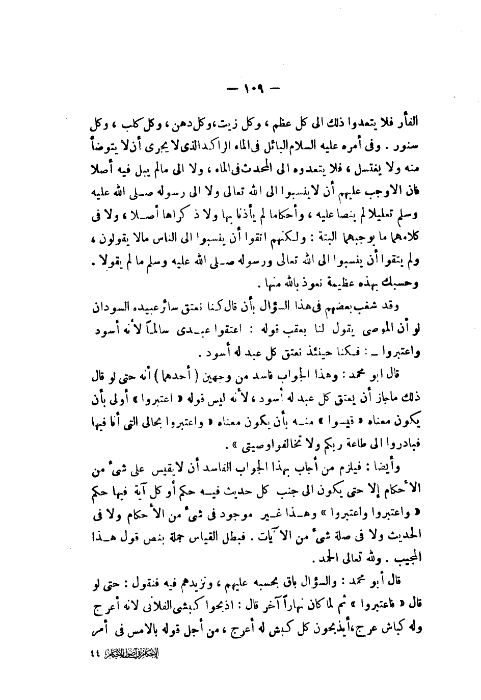 أحدهما أنه حتى لو قال ذلك ما جاز أن يعتق كل عبد له أسود لأنه ليس قوله اعتبروا أولى بأن يكون معناه قيسوا منه بأن يكون معناه واعتبروا بحالي التي أنا فيها فبادروا إلى طاعة ربكم ولا تخالفوا وصيتي وأيضا فيلزم من أجاب بهذا الجواب الفاسد ألا يقيس على شيء من الأحكام إلا حتى يكون إلى جنب كل حديث فيه حكم أو كل آية فيها حكم واعتبروا واعتبروا وهذا غير موجود في شيء من الأحكام ولا في الحديث ولا في صلة شيء من الآيات فبطل القياس جملة بنص قوله هذا المجيب والله تعالى الحمد قال أبو محمد والسؤال باق بحسبه عليهم ونزيدهم فيه فنقول حتى لو قال فاعتبروا ثم لما كان نهارا آخر قال اذبحوا كبشي الفلاني لأنه أعرج وله كباش عرج أيذبحون كل كبش له أعرج من أجل قوله بالأمس في أمر