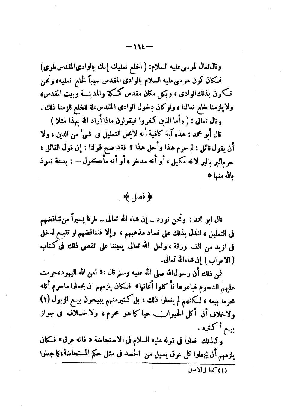 وقال تعالى لموسى عليه السلام {إني أنا ربك فخلع نعليك إنك بلواد لمقدس طوى} فكان كون موسى عليه السلام بالوادي المقدس سببا لخلع نعليه ونحن نكون بذلك الوادي وبكل مكان مقدس كمكة والمدينة وبيت المقدس ولا يلزمنا خلع نعالنا ولو كان دخول الوادي المقدس علة للخلع للزمنا ذلك وقال تعالى {إن لله لا يستحى أن يضرب مثلا ما بعوضة فما فوقها فأما لذين آمنوا فيعلمون أنه لحق من ربهم وأما لذين كفروا فيقولون ماذآ أراد لله بهذا مثلا يضل به كثيرا ويهدي به كثيرا وما يضل به إلا لفاسقين} قال أبو محمد هذه آية كافية إنه لا يحل التعليل في شيء من الدين ولا أن يقول قائل لم حرم هذا وأحل هذا فقد صح قولنا إن قول القائل حرم البر بالبر لأنه مكيل أو أنه مدخل أو أنه مأكول بدعة نعوذ بالله منها فصل في تناقض قولهم في التعليل والقياس قال أبو محمد ونحن نورد إن شاء الله تعالى طرفا يسيرا من تناقضهم في التعليل لندل بذلك عن إفساد مذهبهم وإلا فتناقضهم لو تتبع لدخل في أزيد من ألف ورقة ولعل الله تعالى يعيننا على تقصي ذلك في كتاب الإعراب إن شاء الله تعالى فمن ذلك أن رسول الله صلى الله عليه وسلم قال لعن الله اليهود حرمت عليهم الشحوم فباعوها فأكلوا أثمانها فكان يلزمهم أن يجعلوا ما حرم أكله محرما بيعه لكنهم لم يفعلوا ذلك بل