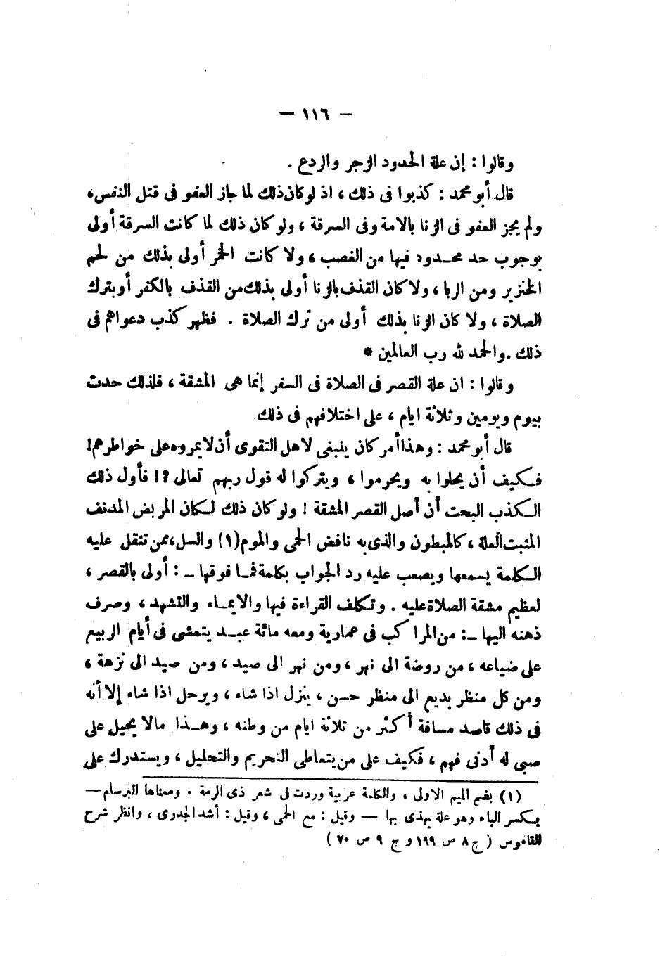قال أبو محمد كذبوا في ذلك إذا كان ذلك لما جاز العفو في قتل النفس ولم يجز العفو في الزنى بالأمة وفي السرقة ولو كان ذلك لما كانت السرقة أولى بوجوب حد محدود فيها من الغضب ولا كانت الخمر أولى بذلك من لحم الخنزير ومن الربا ولا كان الزنى أولى بذلك من القذف بالكفر أو بترك الصلاة ولا كان الزنى بذلك أولى من ترك الصلاة فظهر كذب دعواهم في ذلك والحمد لله رب العالمين وقالوا إن علة القصر في الصلاة في السفر إنما هي المشقة فلذلك حدت بيوم ويومين وثلاثة أيام على اختلافهم في ذلك قال أبو محمد وهذا أمر كان ينبغي لأهل التقوى ألا يمروه على خواطرهم فكيف أن يحلوا به ويحرموا ويتركوا له قول ربهم تعالى فأول ذلك الكذب البحث أن أصل القصر المشقة ولو كان ذلك لكان المريض المدنف المثبت العلة كالمبطون والذي به ناقض الحمى والموم والسل ممن تثقل عليه الكلمة يسمعها ويصعب عليه رد الجواب بكلمة فما فوقها أولى بالقصر العظيم مشقة الصلاة عليه وتكلف القراءة فيها والإيماءة والتشهد صرف ذهنه إليها من المراكب في عمارية ومعه مائة عبد يتمشى في أيام الربيع على ضياعه من روضة إلى نهر ومن نهر إلى صيد ومن صيد إلى نزهة ومن كل منظر بديع إلى منظر حسن ينزل إذا شاء ويرجل إذا شاء إلا أنه من ذلك قاصد مسافة أكثر من ثلاثة أيام من وطنه وهذا ما لا يحيل على صبي له أدنى فهم فكيف على من يتعاطى التحريم والتحليل ويستدرك على