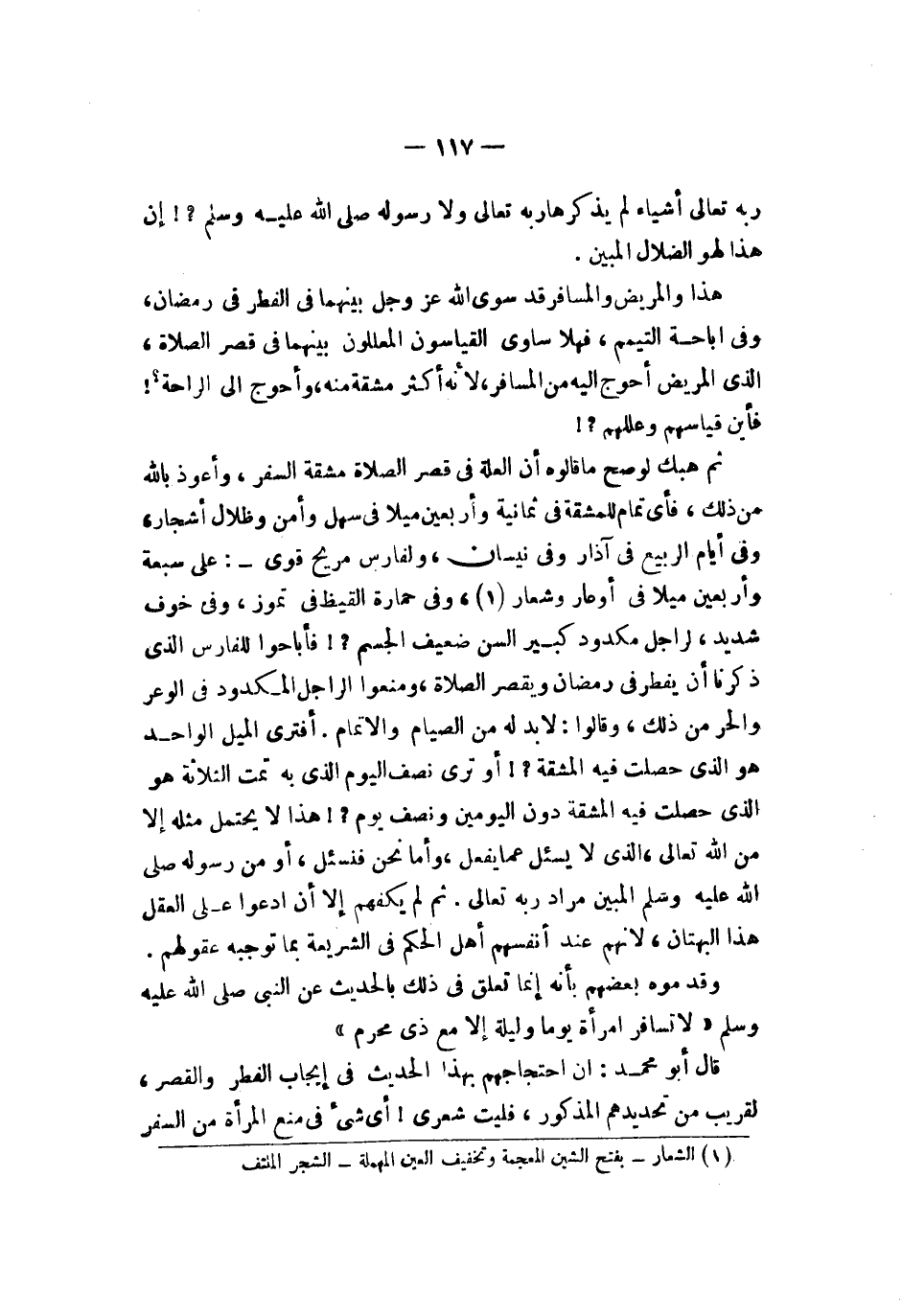 فأباحوا للفارس الذي ذكرنا أن يفطر في رمضان ويقصر الصلاة ومنعوا الرجل المكدود في الوعر والحر من ذلك وقالوا لا بد له من الصيام والإتمام أفترى الميل الواحد هو الذي حصلت فيه المشقة أو ترى نصف اليوم الذي به تمت الثلاثة هو الذي حصلت المشقة دون اليومين ونصف يوم هذا لا يحتمل مثله إلا من الله تعالى الذي لا يسأل عما يفعل وأما نحن فنسأل أو من رسوله صلى الله عليه وسلم المبين مراد ربه تعالى ثم لم يكفهم إلا أن ادعوا على العقل هذا البهتان لأنهم عند أنفسهم أهل الحكمة في الشريعة بما توجبه عقولهم وقد موه بعضهم بأنه إنما تعلق في ذلك الحديث عن النبي صلى الله عليه وسلم لا تسافر امرأة يوما وليلة إلا مع ذي محرم قال أبو محمد إن احتجاجهم بهذا الحديث في إيجاب الفطر والقصر والقريب من تحديدهم المذكور فليت شعري أي شيء في منع المرأة من السفر