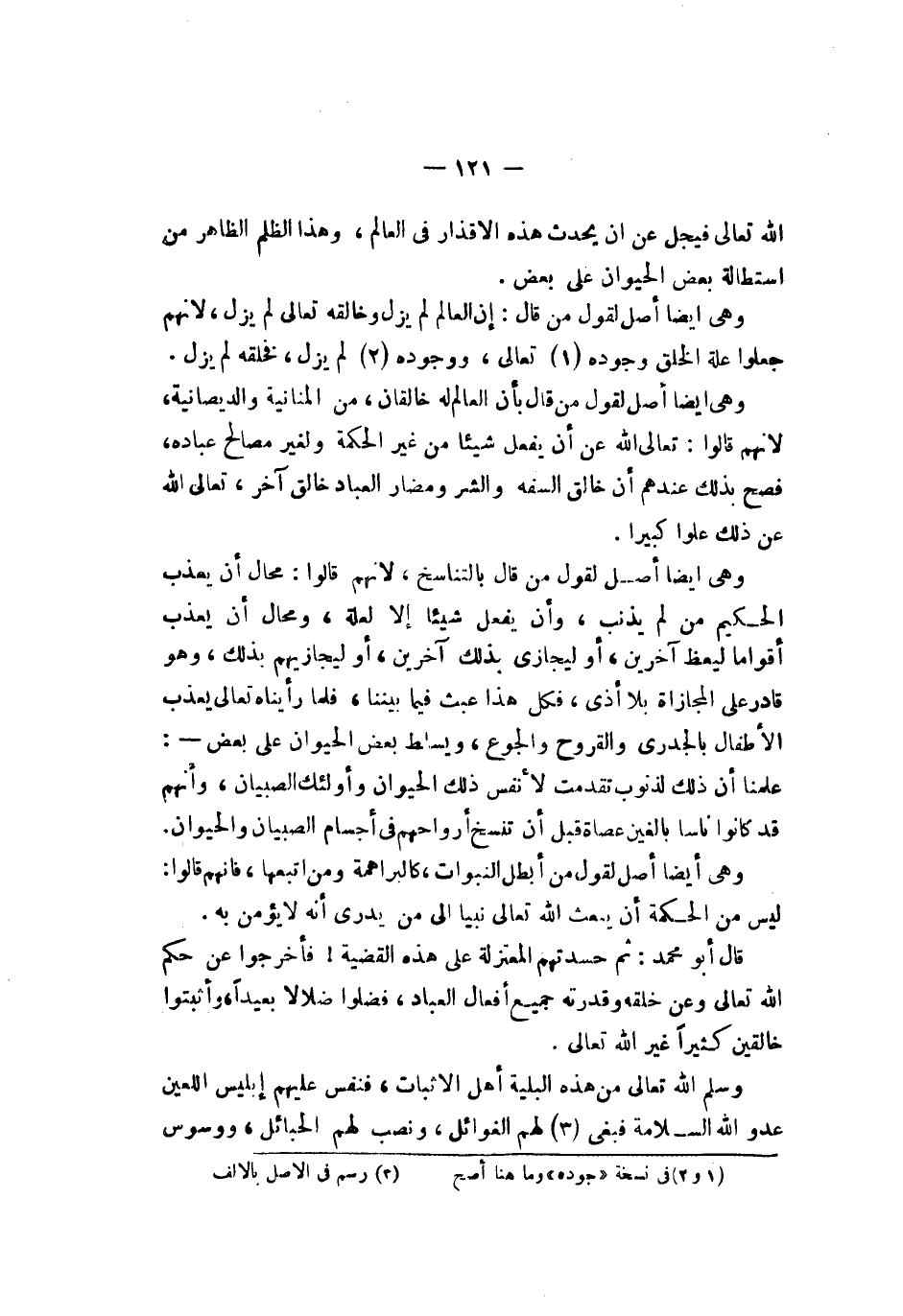 وهي أيضا أصل لقول من قال إن للعالم لم يزل وخالقه تعالى لم يزل لأنهم جعلوا علة الخلق وجوده تعالى ووجوده لم يزل فخلقه لم يزل وهي أيضا أصل لقول من قال بأن العالم له خالقان من المانية والديصانية لأنهم قالوا تعالى الله عن أن يفعل شيئا من غير الحكمة ولغير مصالح عباده فصح بذلك عندهم أن خالق السفه والشر ومضار العباد خالق آخر تعالى عن ذلك علوا كبيرا وهي أيضا أصل لقول من قال بالتناسخ لأنهم قالوا محال أن يعذب الحكيم من لم يذنب وأن يفعل شيئا إلا لعلة ومحال أن يعذب أقواما ليعظ آخرين أو ليجازي بذلك آخرين أو ليجازيهم بذلك وهو قادر على المجازاة بلا أذى ذلك هذا عبث فيما بيننا فلما رأيناه تعالى يعذب الأطفال بالجدري والقروح والجوع ويسلط بعض الحيوان على بعض علمنا أن ذلك لذنوب تقدمت لأنفس ذلك الحيوان وأولئك الصبيان وأنهم قد كانوا بالغين عصاه قبل أن تنسخ أرواحهم في أجسام الصبيان والحيوان وهي أيضا أصل لقول من أبطل النبوات كالبراهمة ومن اتبعها فإنهم قالوا ليس من الحكمة أن يبعث الله تعالى نبيا إلى من يدري أنه لا يؤمن به قال أبو محمد ثم حسدتهم المعتزلة على هذه القضية فأخرجوا على حكم الله تعالى وعن خلقه وقدرته وجميع أفعال العباد فضلوا ضلالا بعيدا وأثبتوا خالقين كثيرا غير الله تعالى وسلم الله تعالى من هذه البلية أهل الإثبات فنفس عليهم إبليس اللعين عدو الله السلامة فبغي لهم الغوائل ونصب لهم الحبائل ووسوس