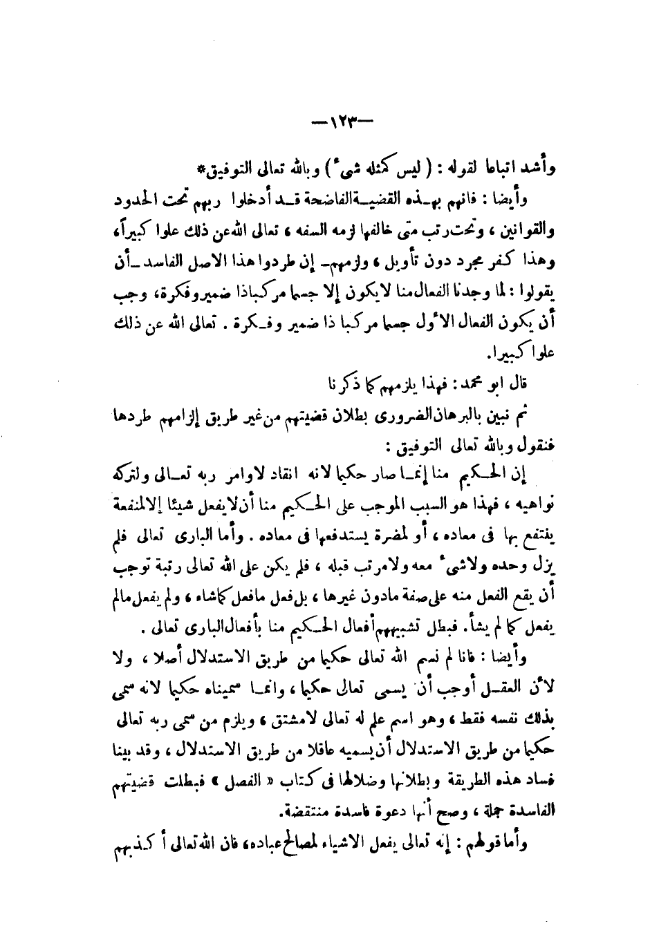 كما شاء ولم يفعل ما لم يفعل كما لم يشأ فبطل تشبيههم أفعال الحكيم منا بأفعال الباري تعالى وأيضا فإنا لم نسم الله تعالى حكيما من طريق الاستدلال أصلا ولا لأن العقل أوجب أن يسمى تعالى حكيما وإنما سميناه حكيما لأنه سمى بذلك نفسه فقط وهو اسم علم له تعالى لا مشتق ويلزم من سمى ربه تعالى حتما من طريق الاستدلال أن يسميه عاقلا من طريق الاستدلال وقد بينا فساد هذه الطريقة وبطلانها وضلالها في كتاب الفصل فبطلت قضيتهم الفاسدة جملة وصح أنها دعوة فاسدة منتقضة وأما قولهم إنه تعالى يفعل الأشياء لمصالح عباده فإن الله تعالى أكذبهم
