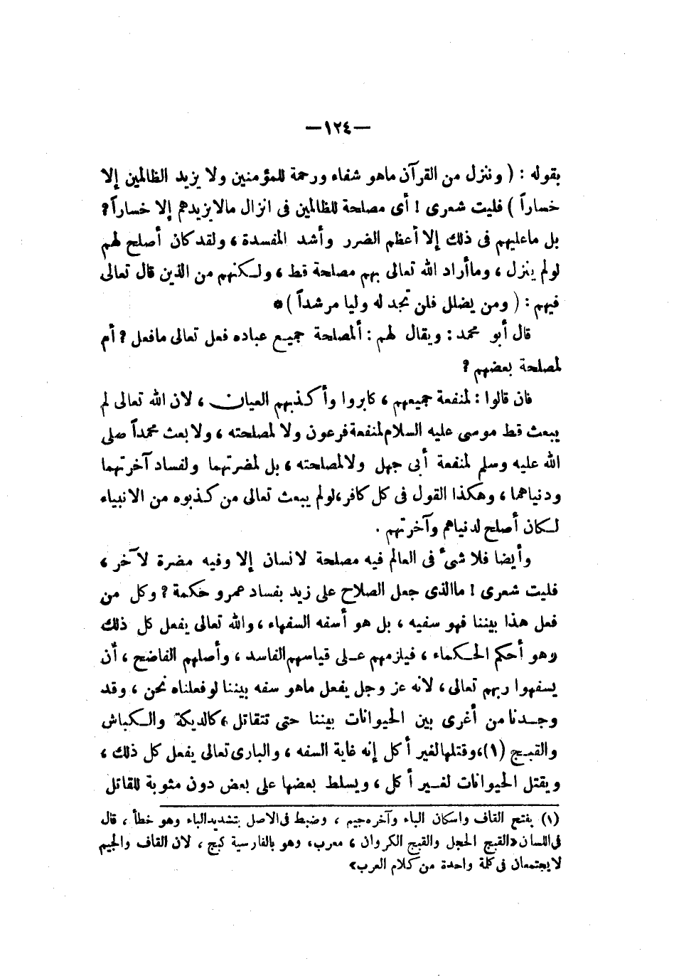 بقوله {وإما تعرضن عنهم بتغآء رحمة من ربك ترجوها فقل لهم قولا ميسورا} فليت شعري أي مصلحة للظالمين في إنزال ما لا يزيدهم إلا خسارا بل ما عليهم في ذلك إلا أعظم الضرر وأشد المفسدة ولقد كان أصلح لهم لو ينزل وما أراد الله تعالى بهم مصلحة قط ولكنهم من الذين قال تعالى فيهم {وترى لشمس إذا طلعت تزاور عن كهفهم ذات ليمين وإذا غربت تقرضهم ذات لشمال وهم في فجوة منه ذلك من آيات لله من يهد لله فهو لمهتد ومن يضلل فلن تجد له وليا مرشدا} قال أبو محمد ويقال لهم المصلحة جميع عباده فعل تعالى ما فعل أم لمصلحة بعضهم فإن قالوا لمنفعة جميعهم كابروا وأكذبهم العيان لأن الله تعالى لم يبعث قط موسى عليه السلام لمنفعة فرعون ولا لمصلحته ولا بعث محمدا صلى الله عليه وسلم لمنفعة أبي جهل ولا لمصلحته بل لمضرتهما ولفساد آخرتهما ودنياهما وهكذا القول في كل كافر لو لم يبعث الله من كذبوه من الأنبياء لكان أصلح لدنياهم وآخرتهم وأيضا فلا شيء في العالم فيه مصلحة لإنسان إلا وفيه مضرة لآخر فليت شعري ما الذي جعل الصلاح على زيد بفساد عمرو حكمه وكل من فعل هذا بيننا فهو سفيه بل هو أسفه السفهاء والله تعالى يفعل كل ذلك وهو أحكم الحكماء فيلزمهم على قياسهم الفاسد وأصلهم الفاضح أن يسفهوا ربهم تعالى لأنه عز وجل يفعل ما هو