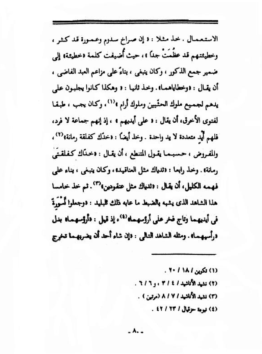 الاستعمال. خذ مثلاً: "إن صراخ سدوم وعمورة قد كثر، وخطيئتهم قد عظُمَتْ جداً"، حيث أُضيفت كلمة "خطيئة" إلى ضمير جمع الذكور، وكان ينبغي، بناءً على مزاعم العبد الفاضي، أن يقال: "وخطاياهما". وخذ ثانياً: "وهكذا كانوا يجلبون على يدهم لجميع ملوك الحثّيين وملوك أرام"، وكان يجب، طيقاً لفتوى الأخرق، أن يقال: "على أيديهم"، إذ إنهم جماعة لا فرد، فلهم أًيْدٍ متعددة لا يد واحدة. وخذ أيضاً: "حذّك كفلقة رمانة"، والمفروض، حسبما يقول المتنطع، أن يقال: "خدّاك كفلقتَى رمانة". وخذ رابعاً: "ثدياك مثل العتاقيد"، وكان ينبغي، بناء على فهمه الكليل، أن يقال: "ثدياك مثل عنقودين". ثم خذ خامساً هذا الشاهد الذي يشبه بالضبط ما عابه ذلك البليد: "وجعلوا أَسْوَرِةً في أيديهما وتاج فخر على أرؤسهماً"، إذ قيل: "أرؤسهما" بدل "رأسيهما". ومثله الشاهد التالي: "إن شاء أحد أن يضربهما تخرج