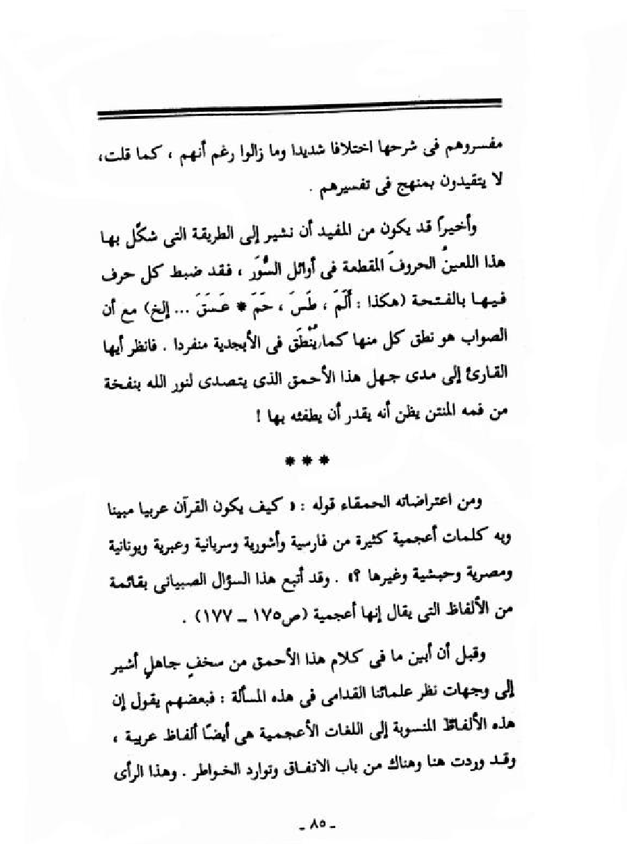 ومن اعتراضاته الحمقاء قوله: "كيف يكون القرآن عربياً مبيناً وبه كلمات أعجمية كثيرة من فارسية وأشورية وسريانية وعبرية ويونانية ومصرية وحبشية وغيرها؟ ". وقد أتبع هذا السؤال الصبياني بقائمة من الألفاظ التي يقال إنها أعجمية (ص 175 - 177) .
