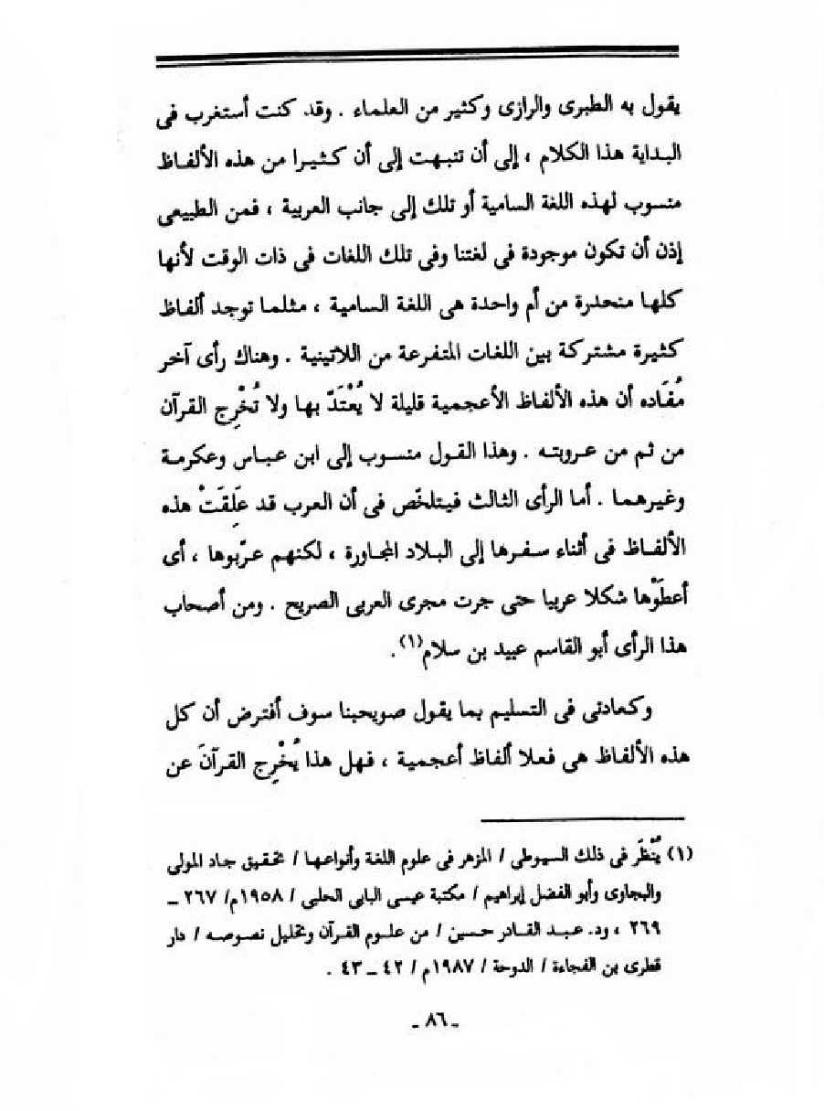 يقول به الطبري والرازي وكثير من العلماء. وقد كنت أستغرب في البداية هذا الكلام، إلى أن تنبهت إلى أن كثير من هذه الألفاظ منسوب لهذه اللغة السامية أو تلك إلى جانب العربية، فمن الطبيعي إذن أن تكون موجودة في لغتنا وفي تلك اللغات في ذات الوقت لأنها كلها منحدرة من م واحدة هي اللغة السامية، مثلما توجد ألفاظ كثيرة مشتركة بين اللغات المتفرعة من اللاتينية. وهناك رأي آخر مُفَاده أن هذه الألفاظ الأعجمية قليلة لا يُعْتَدً بها ولا تُخْرِج القرآن من ثم من عروبته. وهذا القول منسوب إلى ابن عباس وعكرمة وغيرهما. أما الرأي الثالث فيتلخّص في أن العرب قد عَلِقَتْ هذه الألفاظ في أثناء سفرها إلى البلاد المجاورة، لكنهم عرّبوها، أي أعطَوْها شكلاَ عربياً حتى جرت مجرى العربي الصريح. ومن أصحاب هذا الرأي أبو القاسم عبيد بن سلام.