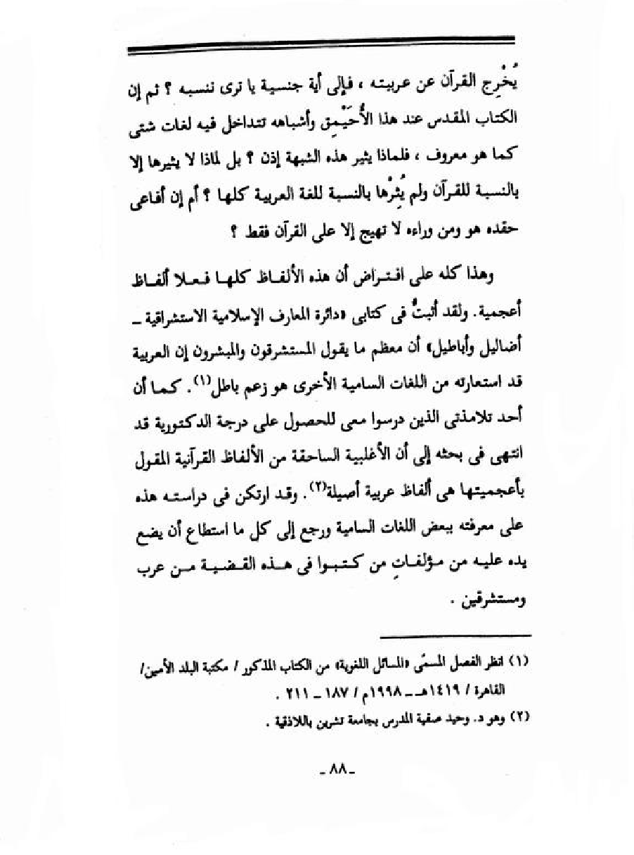 وهذا كله على افتراضأن هذه الألفاظ كلها ألفاظ أعجمية. ولقد أثبتَّ في كتابي "دائرة المعارف الإسلامية الاستشراقية - أضاليل وأباطيل" أن معظم ما يقول المستشرقون والمبشرون إن العربية قد استعارته من اللغات السامية الأخرى هو زعم باطل؟ كما أن أحد تلاميذي الذين درسوا معي للحصول على درجة الدكتورية قد انتهى في بحثه إلى أن الأغلبية الساحقة من الألفاظ القرآنية المقول بأعجميتها هي ألفاظ عربية أصلية. وقد ارتكن في دراسته هذه على معرفته ببعض اللغات السامية ورجع إلى كل ما استطاع أن يضع يده عليه من مؤلفاتِ من كتبوا في هذه القضية من عرب ومستشرقين.
