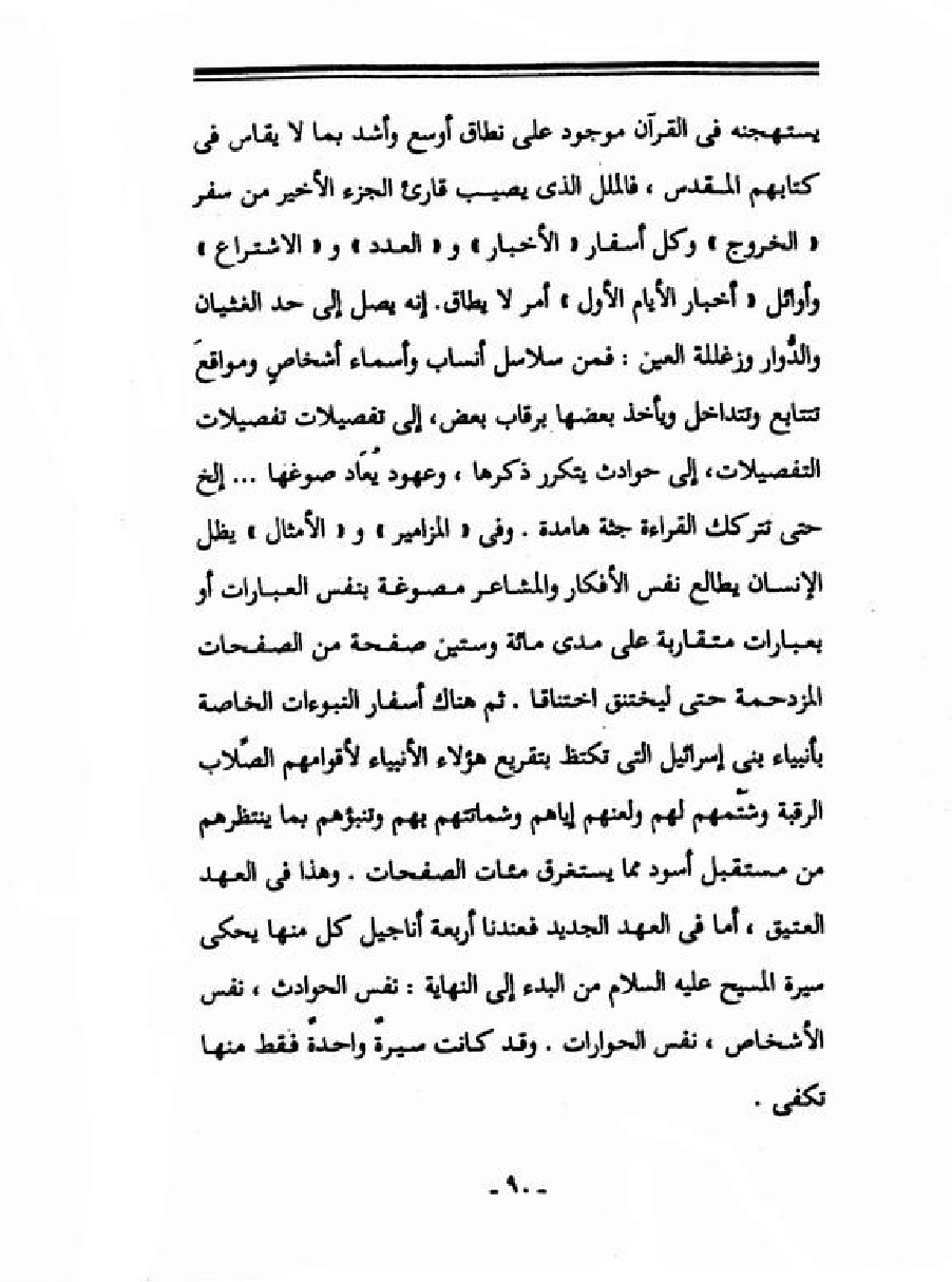 يستهجنه في القرآن موجود على نطاق أوسع وأشد بما لا يقاس في كتابهم المقدس، فالملل الذي يصيب قارئ الجزء الأخير من سفر "الخروج" وكل أسفار "الأخبار" و"العدد" و"الاشتراع" وأوائل "أخبار الأيام الأول" أمر لا يطاق. إنه يصل إلى حد الغثيان والدُّوار وزغللة العين: فمن سلاسل أنساب وأسماء أشخاصٍ ومواقعَ تتابع وتتداخل ويأخذ بعضها برقاب بعض، إلى تفصيلات تفصيلات التفصيلات، إلى حوادث ذكرها، وعهود يُعَاد صوغها ... إلخ حتى تتركك القراءة جثة هامدة. وفي "المزامير" و"الأمثال" يظل الإنسان يطالع نفس الأفكار والمشاعر مصوغة بنفس العبارات أو بعبارات متقاربة على مدى مائة وستين صفحة من الصفحات المزدحمة حتى ليختنق اختناقاً. ثم هناك أسفار النبوءات الخاصة بأنبياء بني إسرائيل التي تكتظ بتفريغ هؤلاء الأنبياء لأقوامهم الصًلاب الرقبة وشَتْمهم لهم ولعنهم إياهم وشماتتهم بهم وتنبؤهم بما ينتظرهم من مستقبل أسود مما يستغرق مئات الصفحات. وهذا في العهد العتيق، أما في العهد الجديد فعندنا أربعة أناجيل كل منها يحكي سيرة المسيح عليه السلام من البدء إلى النهاية: نفس الحوادث، نفس الأشخاص، نفس الحوارات. وقد كانت سيرةٌ واحدةً فقط منها تكفي.