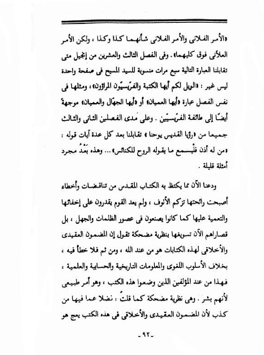 ودعنا الآن مما يكتظ به الكتاب المقدس من تناقضات وأخطاء أصبحت رائحتها تزكم الأنوف، ولم يعد القوم يقدرون على إخفائها والتعمية عليها كما كانوا يصنعون في عصور الظلمات والجهل، بل قصاراهم الآن تسويغها بنظرية مضحكة تقول إن المضمون العقيدي والأخلاقي لهذه الكتابات هو من عند الله، ومن ثم فلا خطأ فيه، بخلاف الأسلوب اللغوي والمعلومات التاريخية والحسابية والعلمية، فهذا من عند المؤلفين الذين وضعوا هذه الكتب، وهو أمر طبيعي لأنهم بشر. وهي نظرية مضحكة كما قلتُ: فضلاً عما فيها من كذب لأن المضمون العقيدي والأخلاقي في هذه الكتب يعج هو