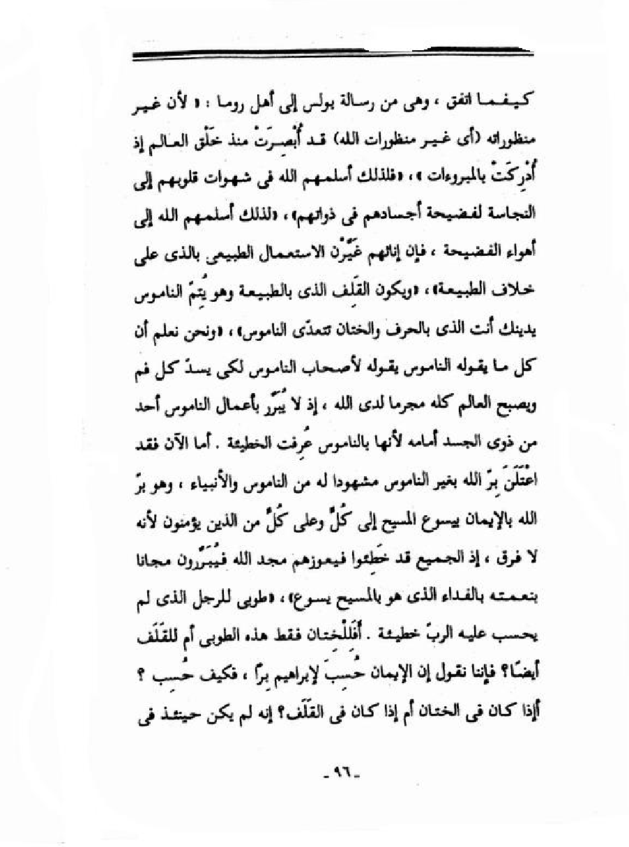 كيفما اتفق، وهي من رسالة بولس إلى أهل روما: "لأن غير منظوراته (أي غير منظورات الله) قد أًبْصِرَتْ منذ خَلْق العالم إذ أَدْرِكَتْ بالمبروءات"، "فلذلك أسلمهم الله في شهوات قلوبهم إلى النجاسة لفضيحة أجسادهم في ذواتهم"، "لذلك أسلمهم الله إلى أهواء الفضيحة، فإن إناثهم غَيًرْن الاستعمال الطبيعي بالذي على خلاف الطبيعة"، "ويكون القَلِف الذي بالطبيعة وهو يِتُمَ الناموي يدينك أنت الذي بالحرف والختان تتعدّى الناموس"، "ونحن نعلم أن كل ما يقوله الناموس يقوله لأصحاب الناموس لكي يسدّ كل فم ويصبح العالم كله مجرماً لدى الله، إذ لا يُبَرًر بأعمال الناموس أحد من ذوي الجسد أمامه لأنها بالناموس عُرِلإت الخطيئة. أما الآن فقد اعْتَلَنَ برَ الله بغير الناموس مشهوداً له من الناموس والأنبياء، وهو برَ الله بالإيمان بيسوع المسيح إلى كُلَّ وعلى كُلَّ من الذين يؤمنون لأنه لا فرق، إذ الجميع قد خَطِئوا فيعوزهم مجد الله فيُبَرَّرون مجاناً بنعمته بالفداء الذي هو بالمسيح يسوع"، "طوبى للرجل الذي لم يحسب عليه الربّ خطيئة. أَفَلِلْخِتان فقط هذه الطوبى أم للقَلَف أيضاً؟ فإننا نقول إن الإيمان حُسِبَ لإبراهيم بِراً، فكيف حُسِب؟ أإذا كان في الختان أن إذا كان في القَلَف؟ إنه لم يمكن حينئذ في