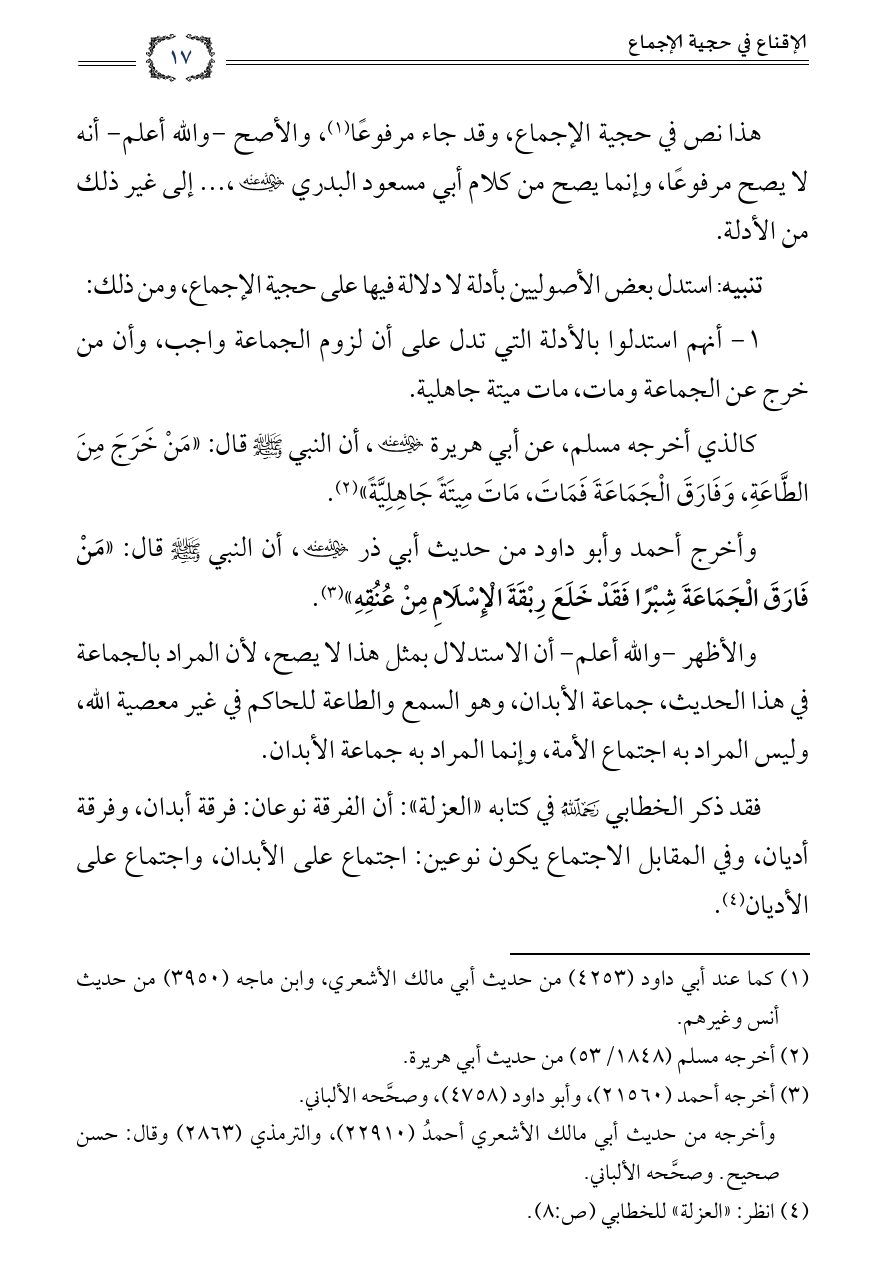 هذا نص في حجية الإجماع وقد جاء مرفوعًا (¬١)، والأصح -والله أعلم-أنه لا يصح مرفوعًا، وإنما يصح من كلام أبي مسعود البدري - رضي الله عنه -، ... إلى غير ذلك من الأدلة.