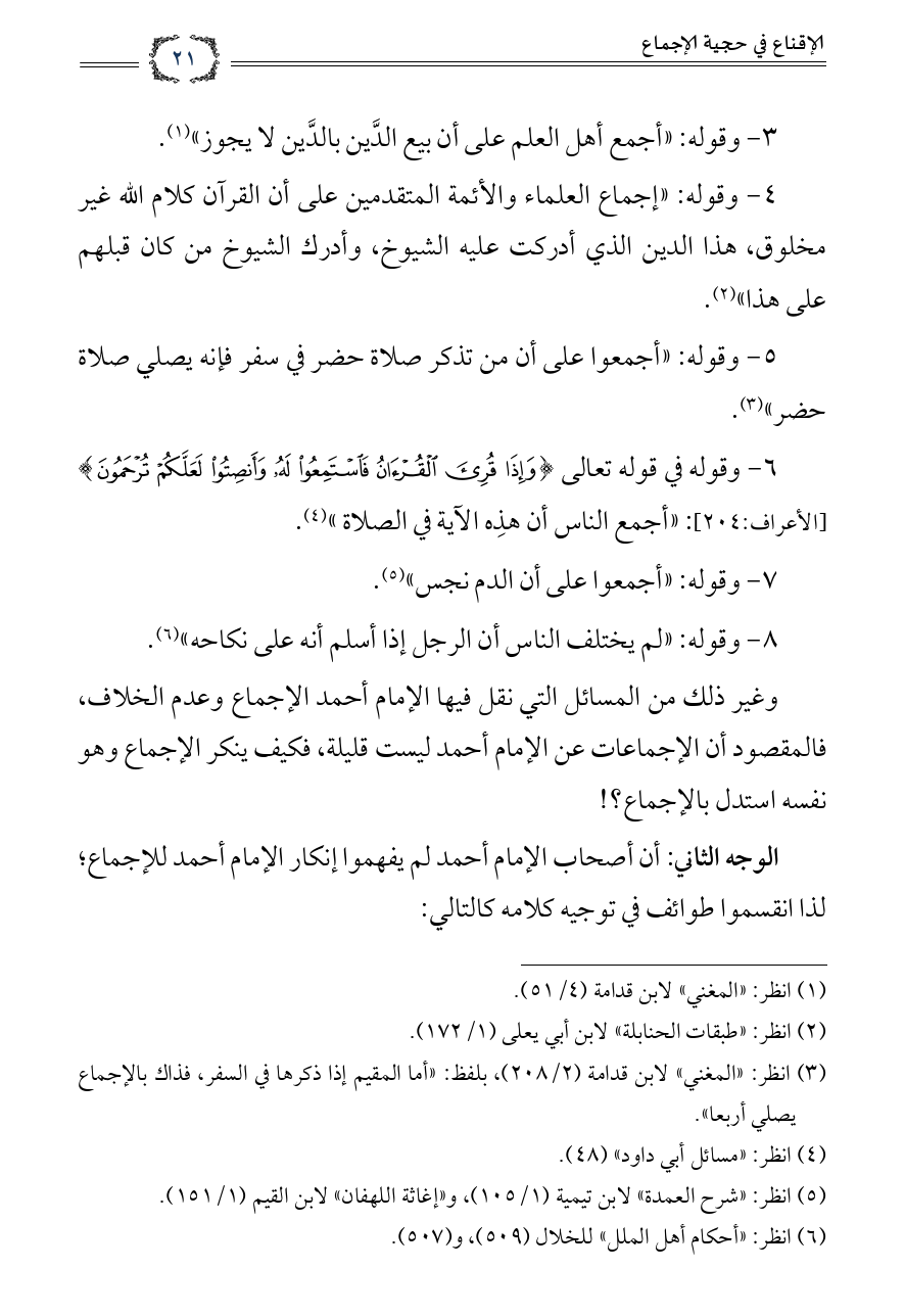 وغير ذلك من المسائل التي نقل فيها الإمام أحمد الإجماع وعدم الخلاف، فالمقصود أن الإجماعات عن الإمام أحمد ليست قليلة، فكيف ينكر الإجماع وهو نفسه استدل بالإجماع؟!